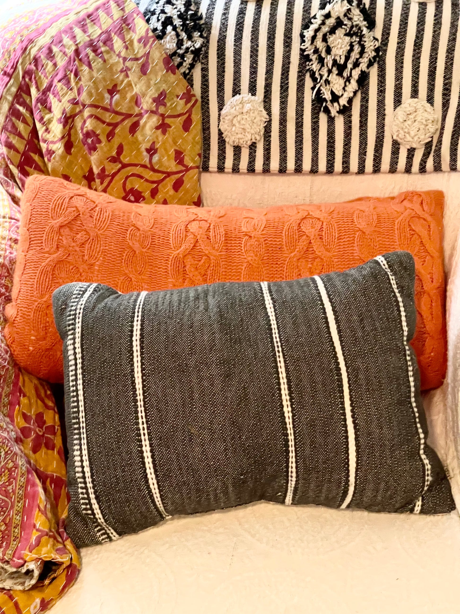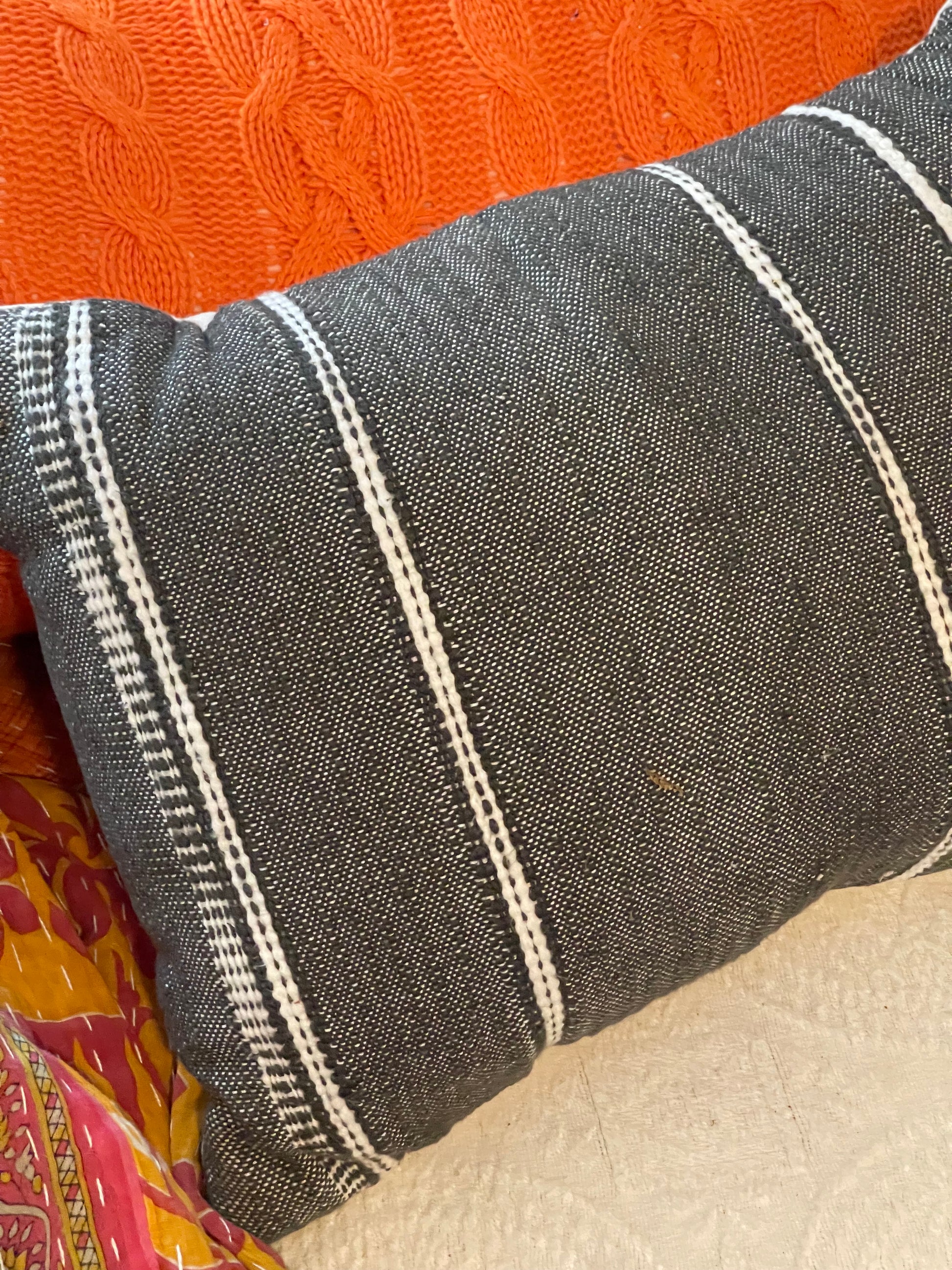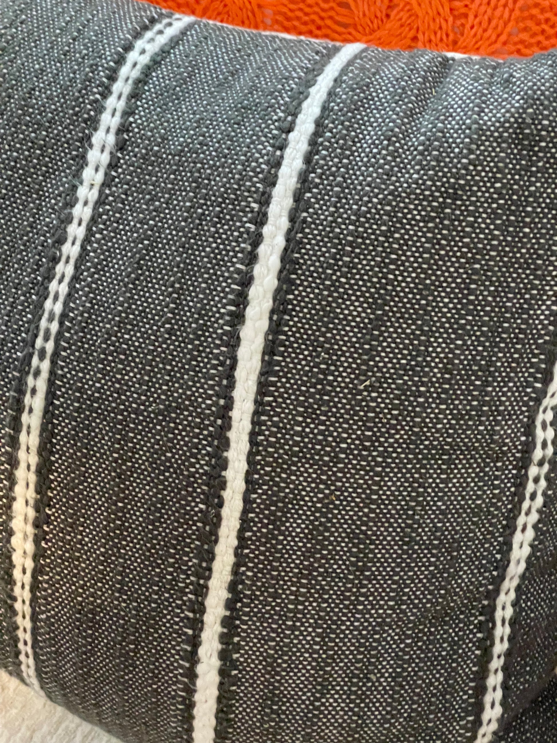 Black striped pillow with a lot of texture. Your room is not complete until you layer in the texture. Whether you like the eclectic boho look, a completely modern structured room or someplace inbetween this black and white texture striped pillow will add softness and comfort to your room. It is so easy to change seasons and update your home by switching pillows in and out with the season change. This is a one of a kind upcycled sweater pillow. It is 20X14”. A perfect length for tossing in texture.
