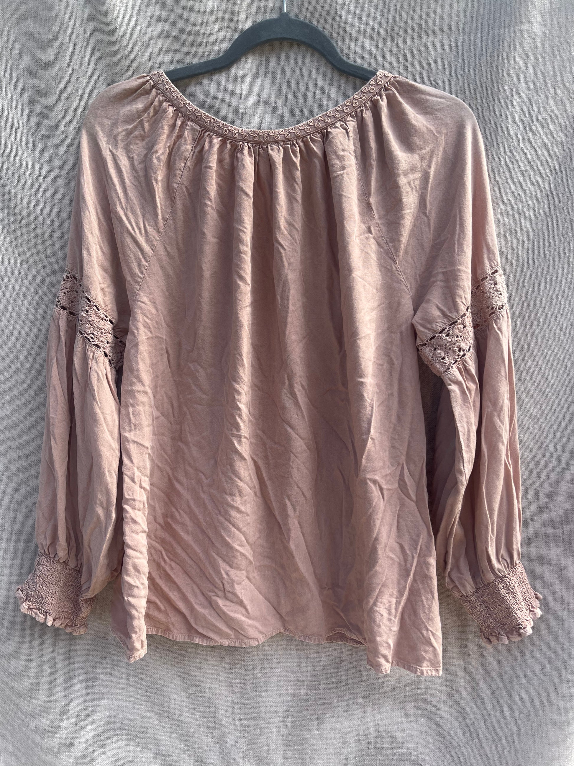 Unleash your inner bohemian with our Bohostyled embroidered top. Infused with the free-spirited style of Freepeople, this top features beautiful embroidery in a soft, sun-drenched peach color. Upgrade your wardrobe with this must-have piece for an effortlessly stylish look. Reloved fashion looks good on you.