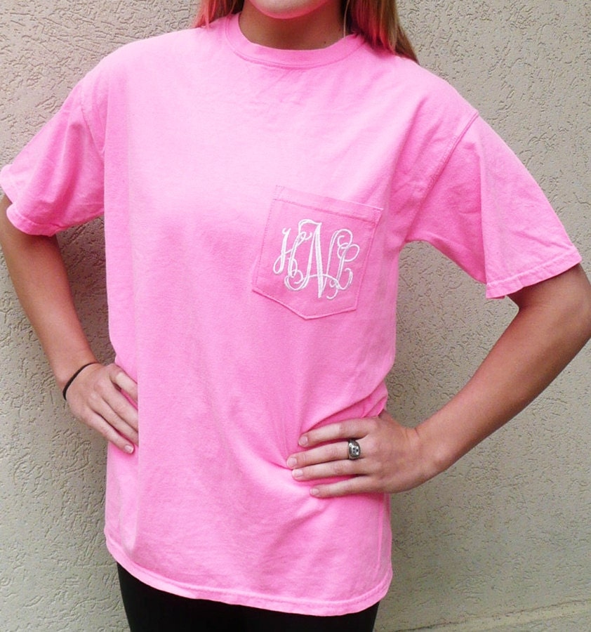 Comfort Colors monogrammed pocket t shirts. new t shirts in great new colors. with a monogrammed pocket. Personalize your pocket. Choose from the round monogram style or the entwined monogram style. These shirts are boy cut and come in sizes small, medium, large and extra large. most colors are 100% cotton. You can choose any color embroidery thread for your t shirt. To place an order all I need to know is what color t shirt you would like, what color thread, and your monogram initials and size. This monogram is sewn through the pocket.