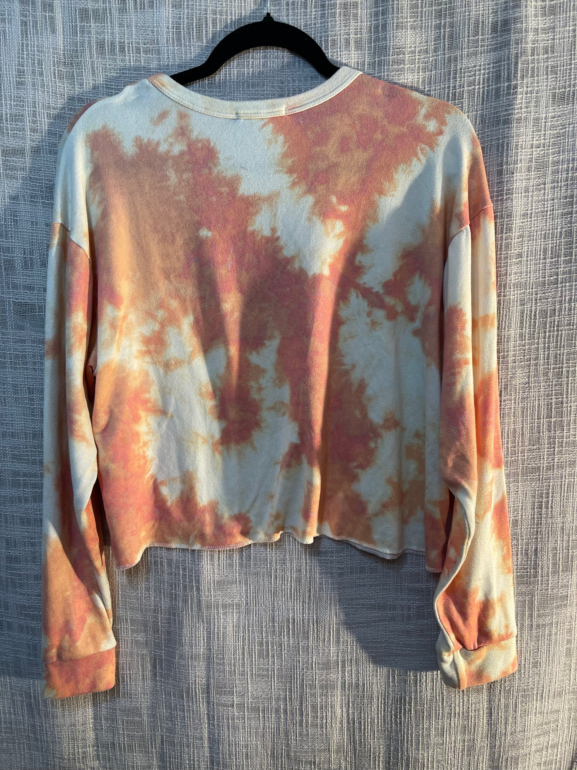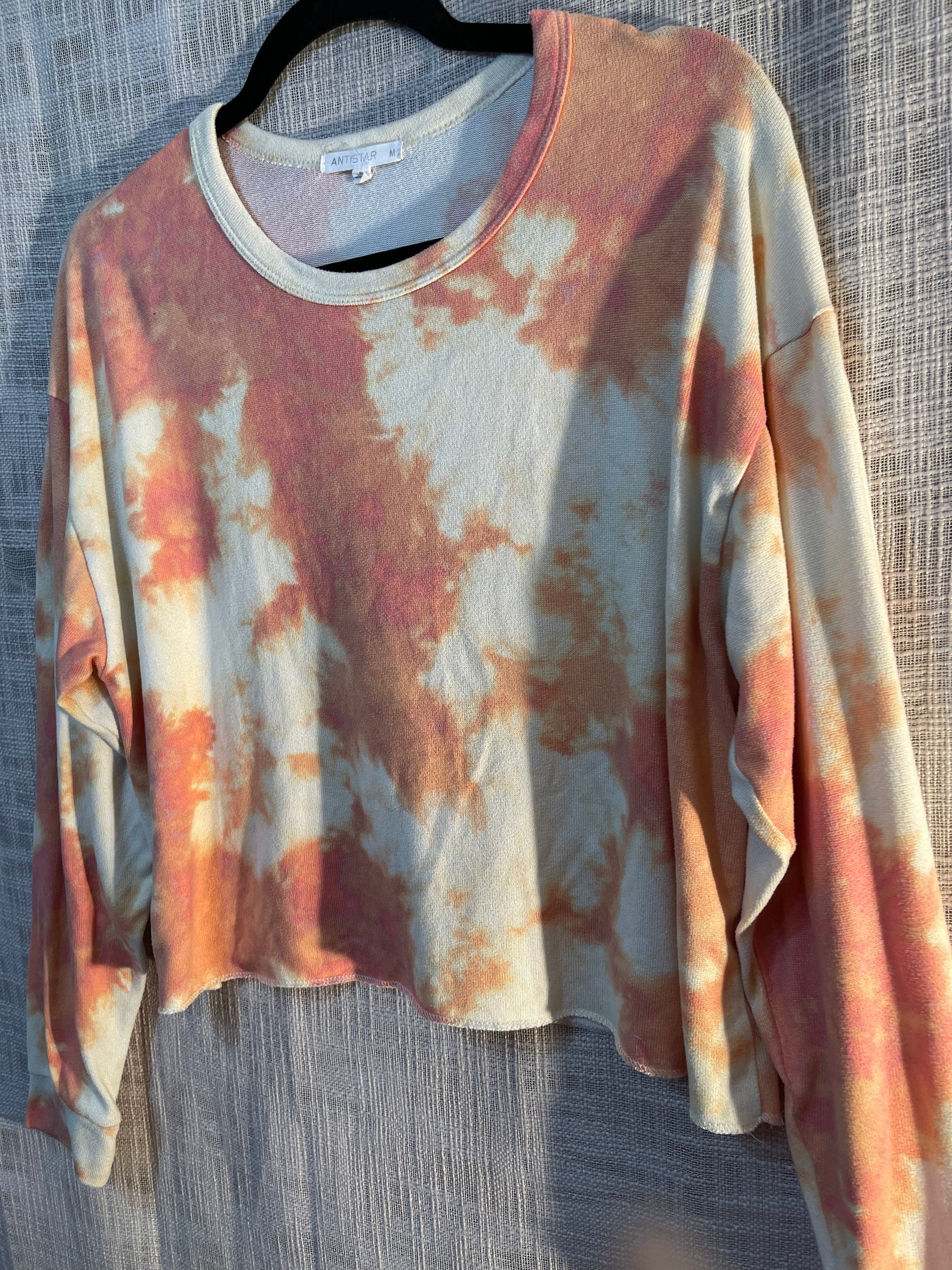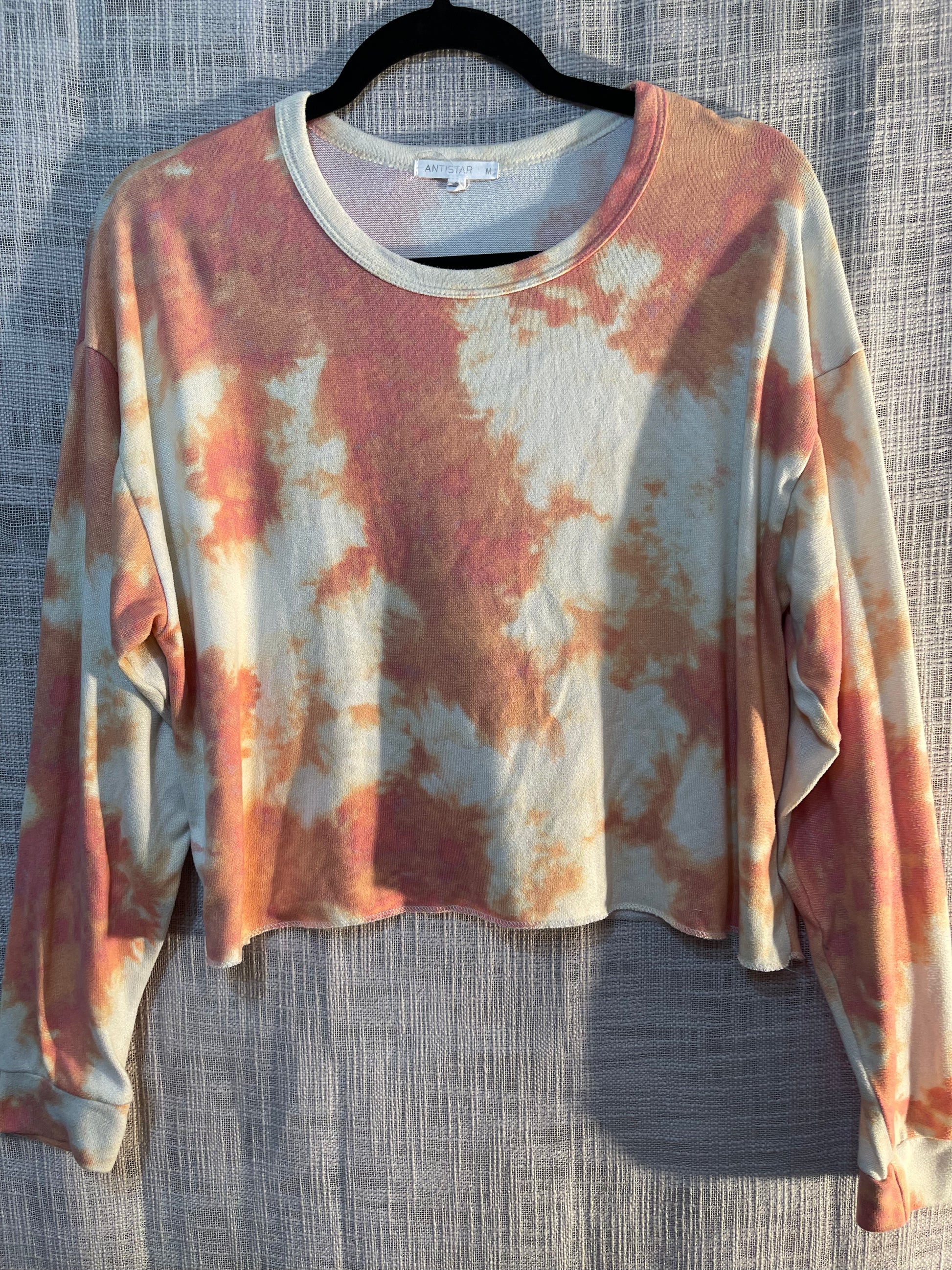 Crop sweatshirt, the kind that you want to wear everyday, all the time. Thus shirt is so comfy you will find excuses to wear it over and over. Perfect for early morning workouts, beach walks, morning coffee the list goes on. We love the fun melon colors in this tie dyed top.