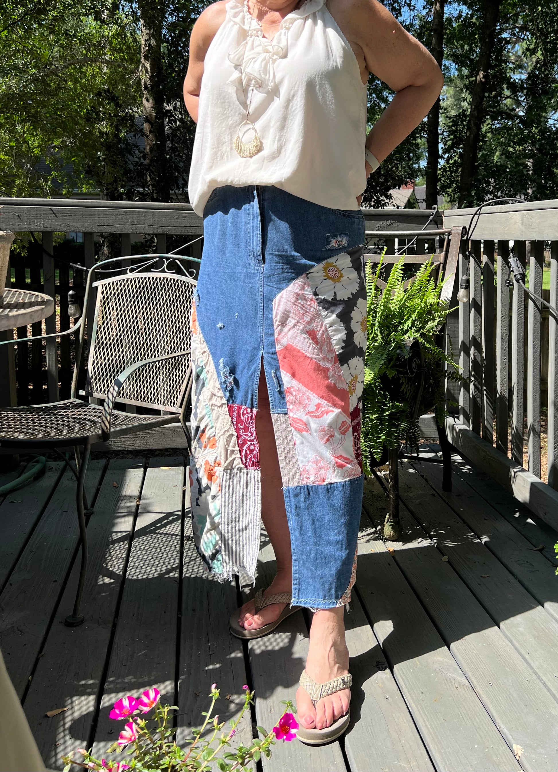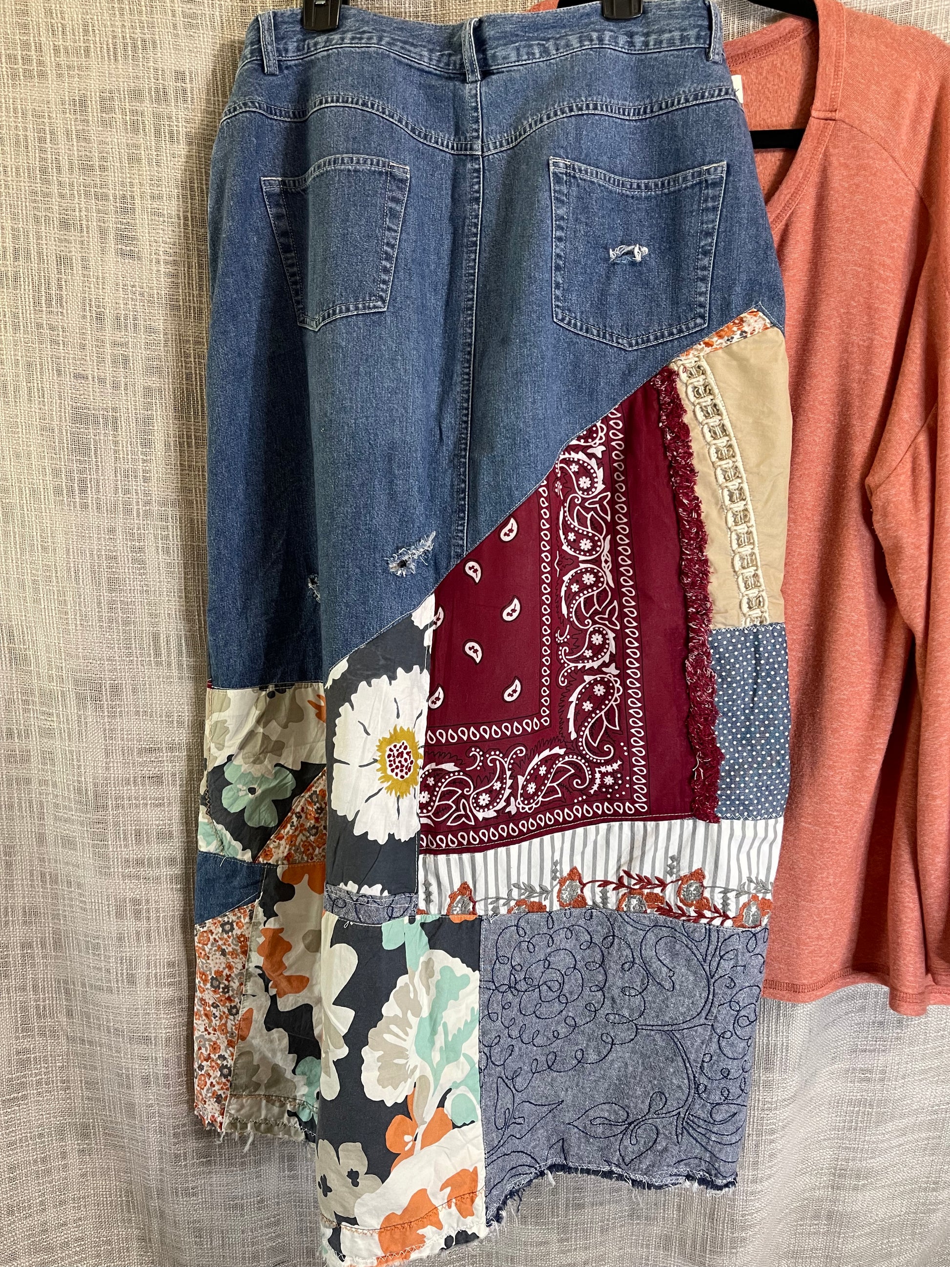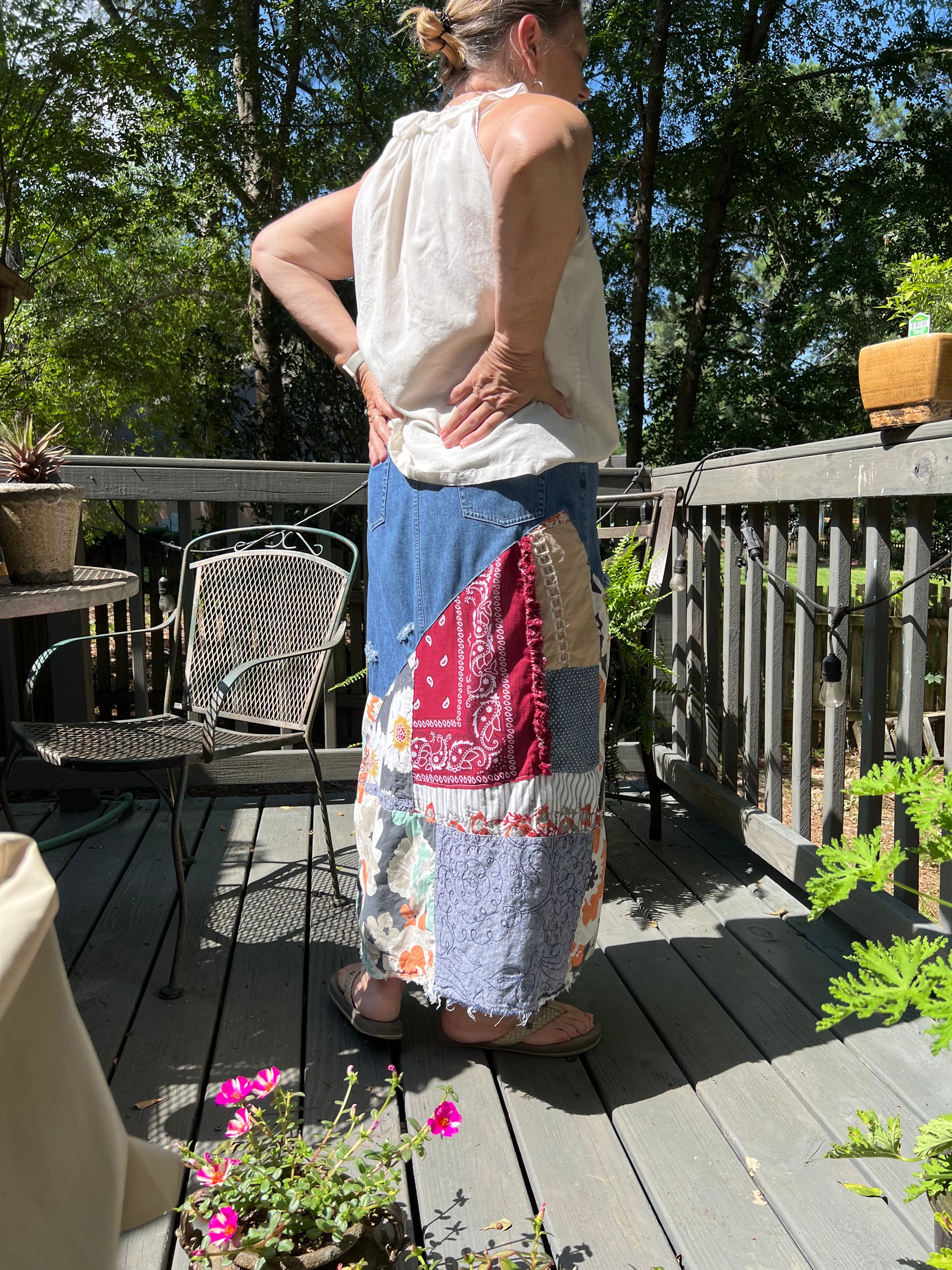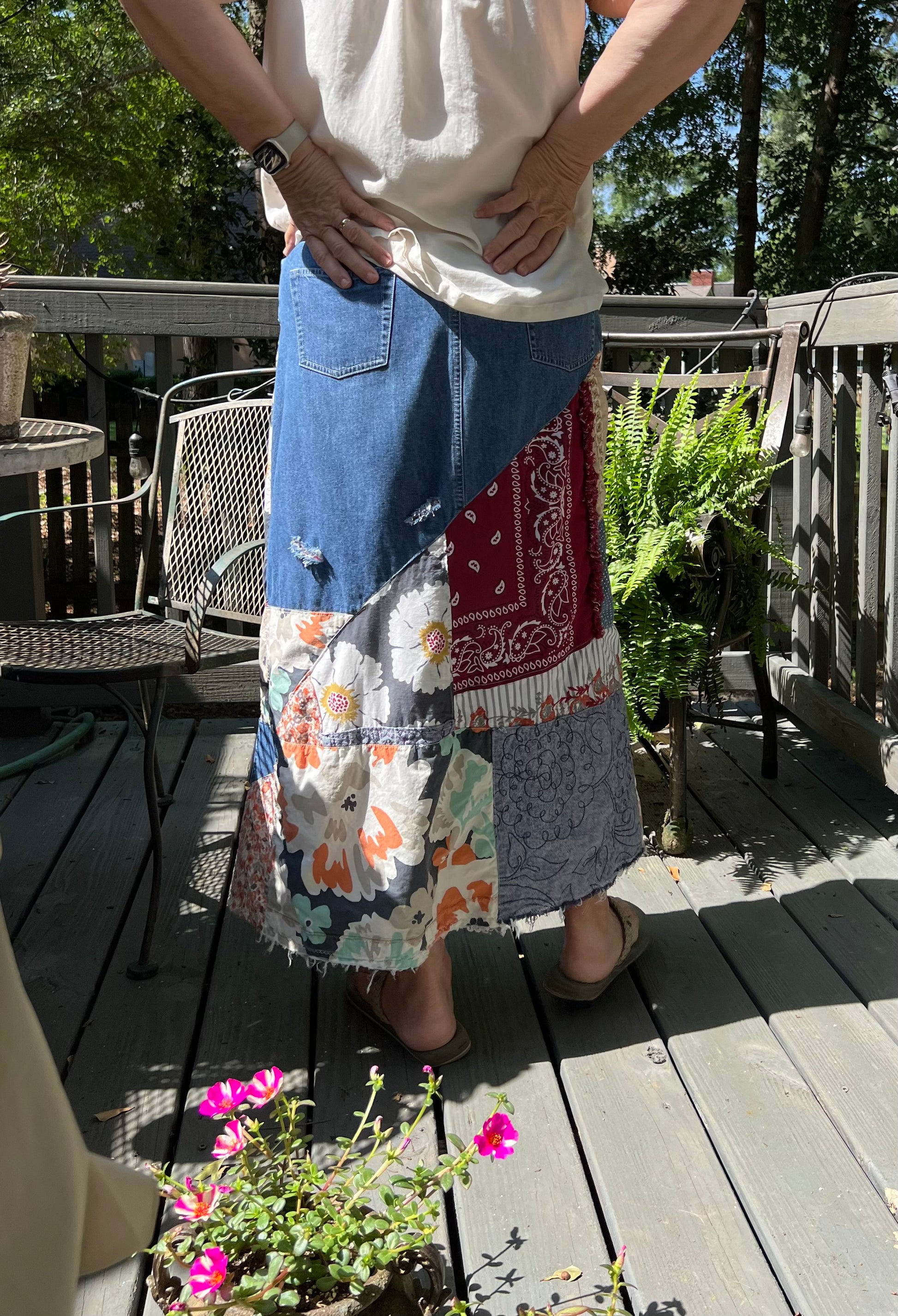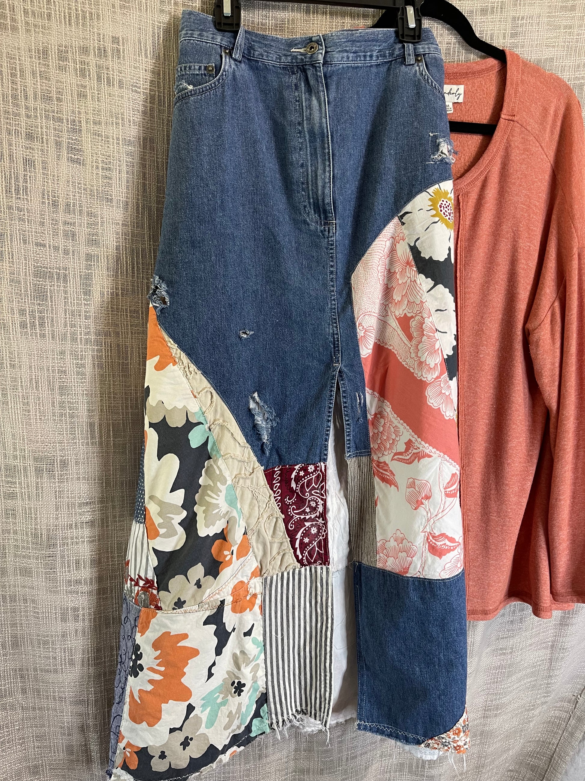 This wonderfully upcycled maxi Jean skirt was reconstructed with a collection of prints and solids. Textures were added with chennile, and embroidery. I love fabrics, I am a self admitted fabric junky, call me a fabric whore if you’d like, I don’t care. I can’t help myself. I look for textures and embellishments, sometimes I save them for years until I have just the right combinations or the right project. This Jean skirt is completed with all the right fabrics. It is a one of a kind patchwork skirt. High waisted zipper front. Front and back pockets