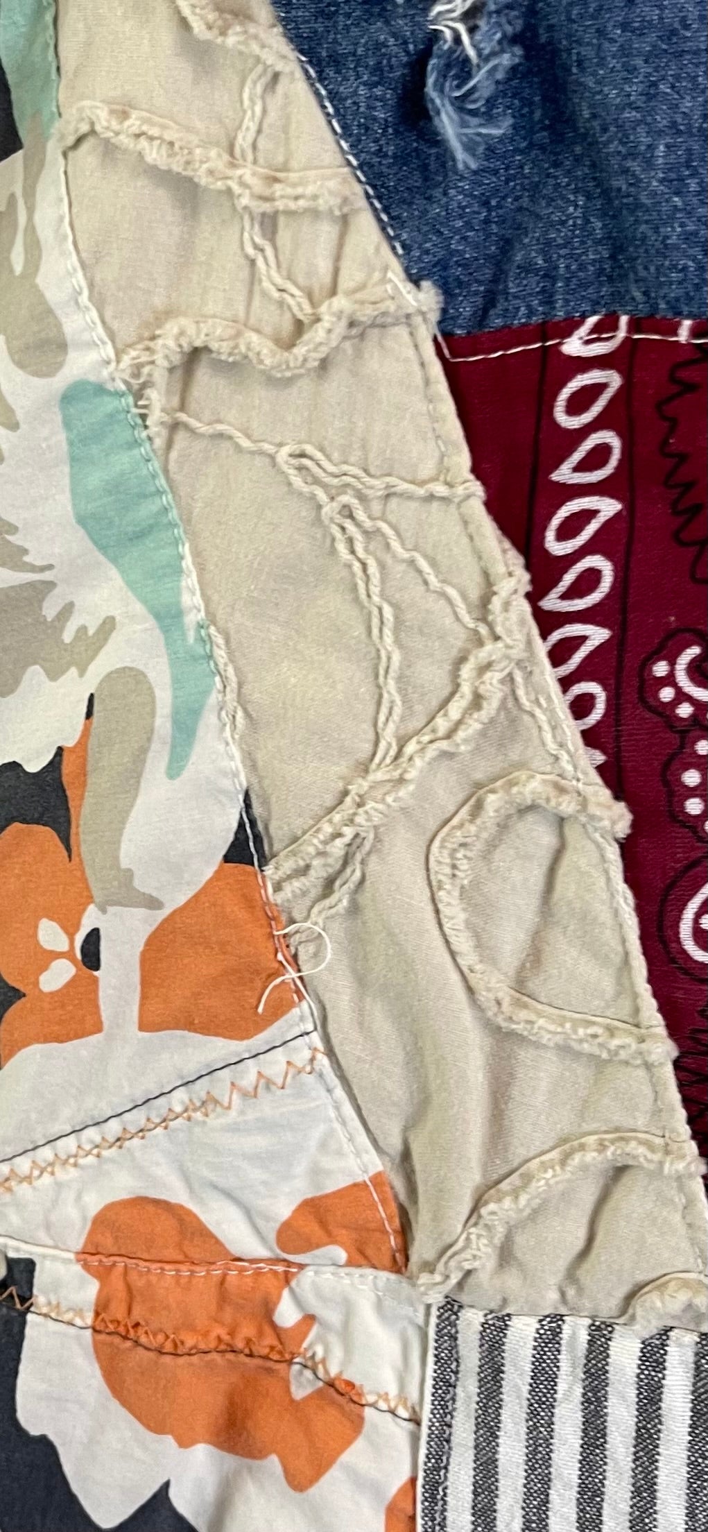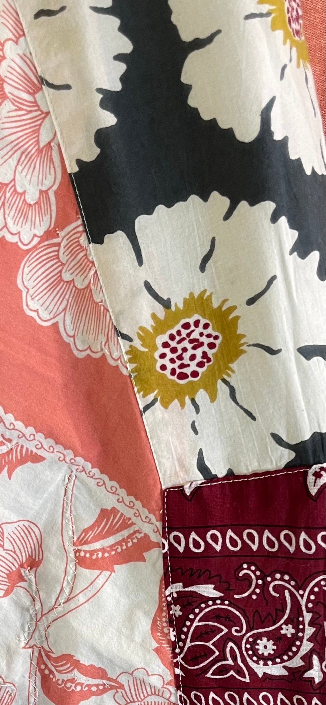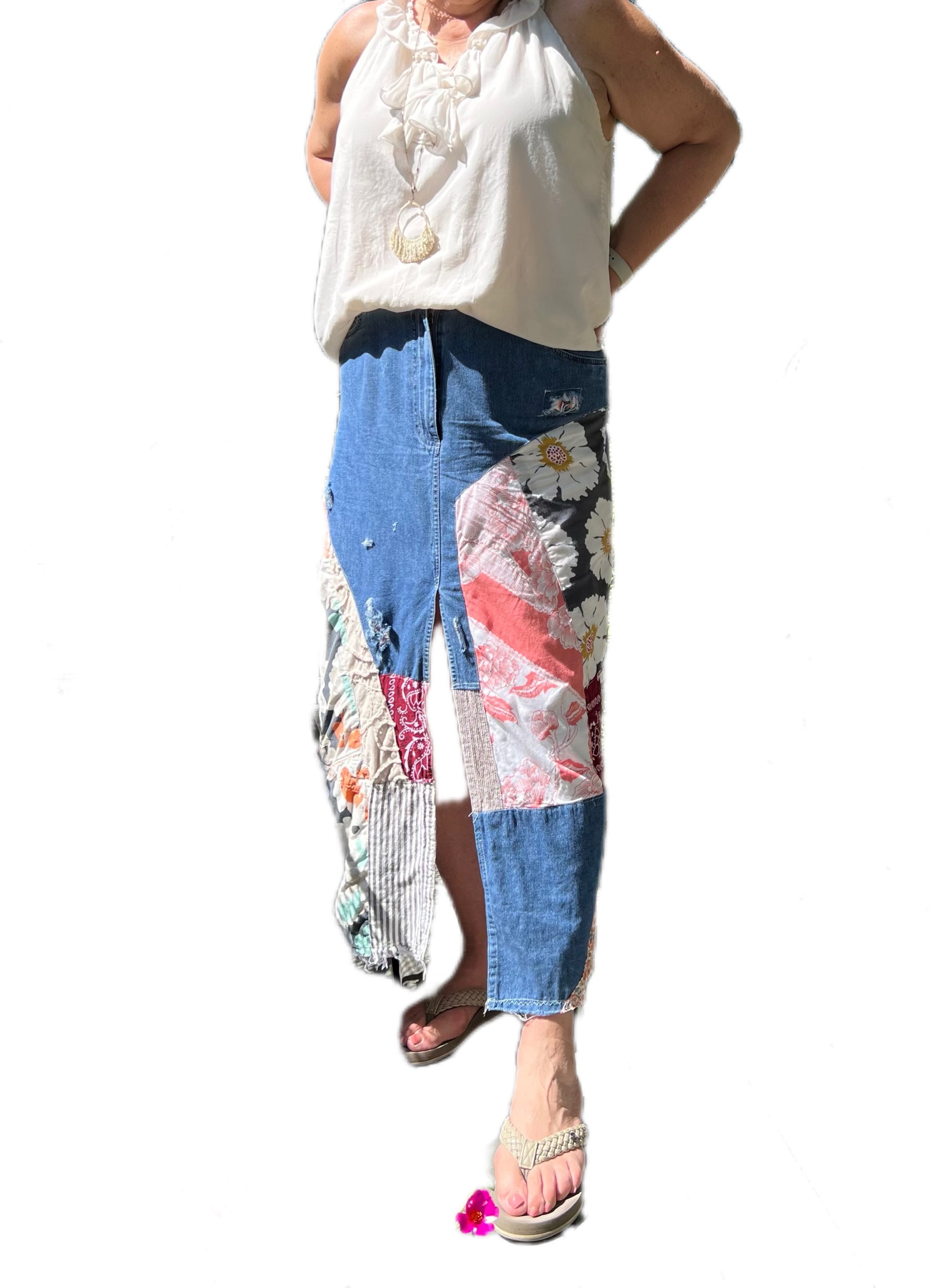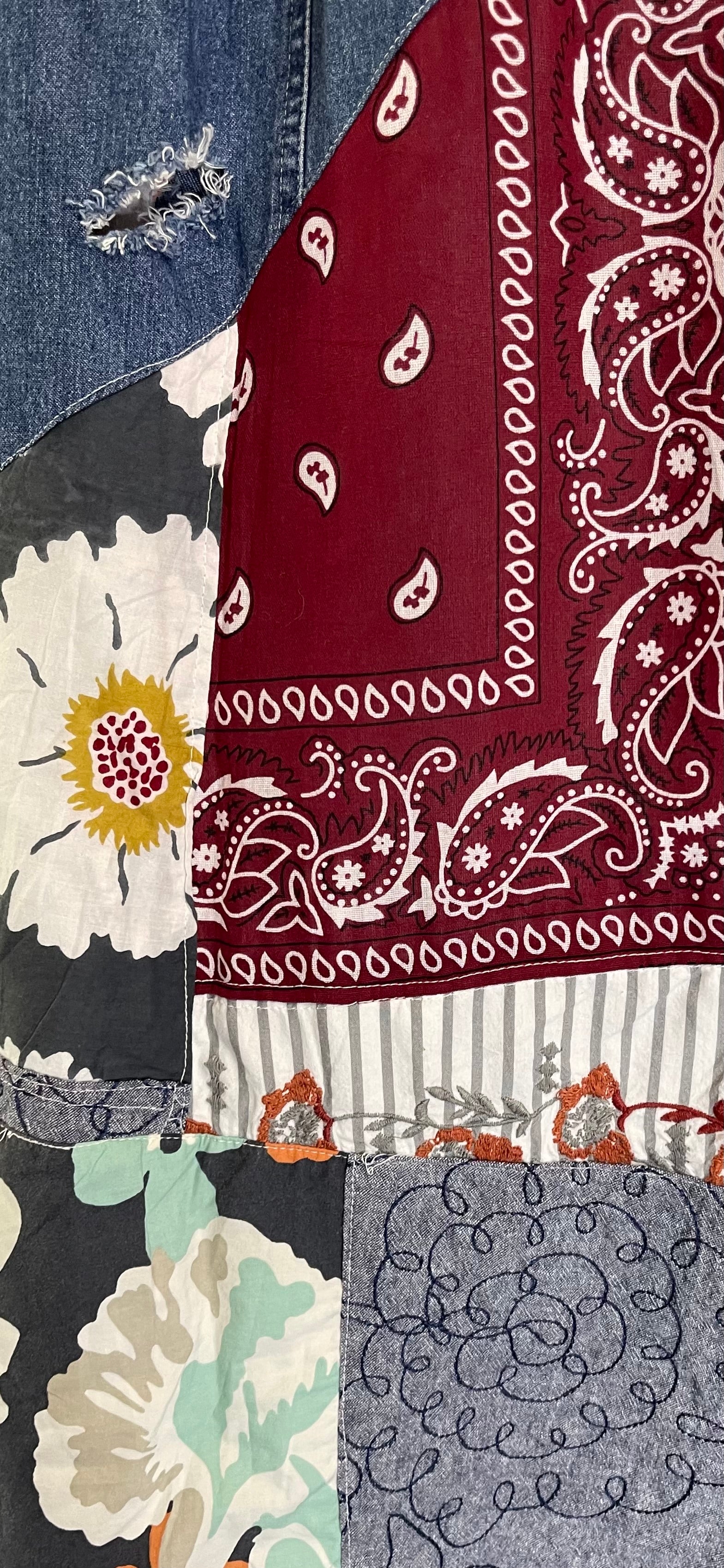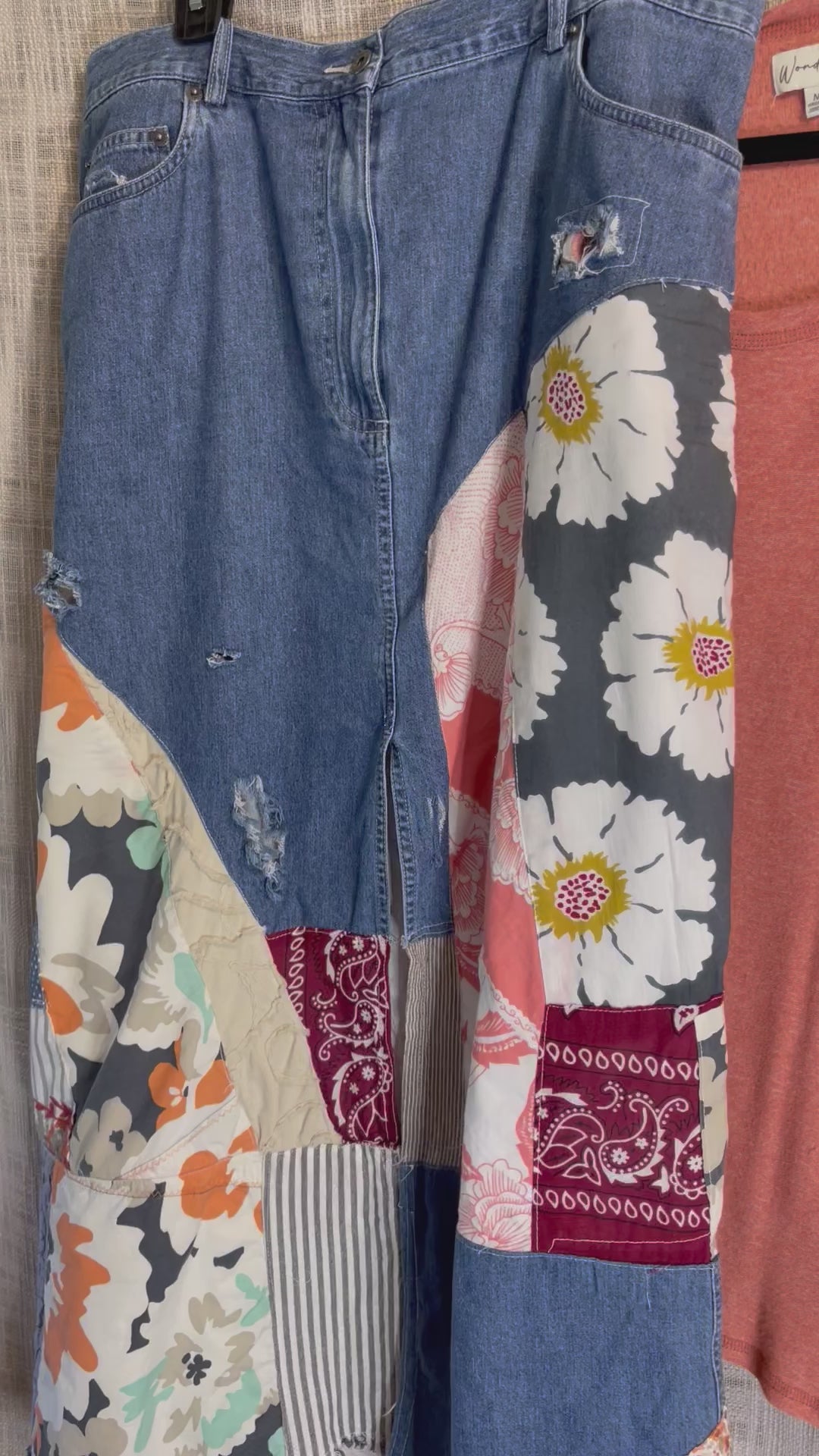 This wonderfully upcycled maxi Jean skirt was reconstructed with a collection of prints and solids. Textures were added with chennile, and embroidery. I love fabrics, I am a self admitted fabric junky, call me a fabric whore if you’d like, I don’t care. I can’t help myself. I look for textures and embellishments, sometimes I save them for years until I have just the right combinations or the right project. This Jean skirt is completed with all the right fabrics. It is a one of a kind patchwork skirt. High waisted zipper front. Front and back pockets