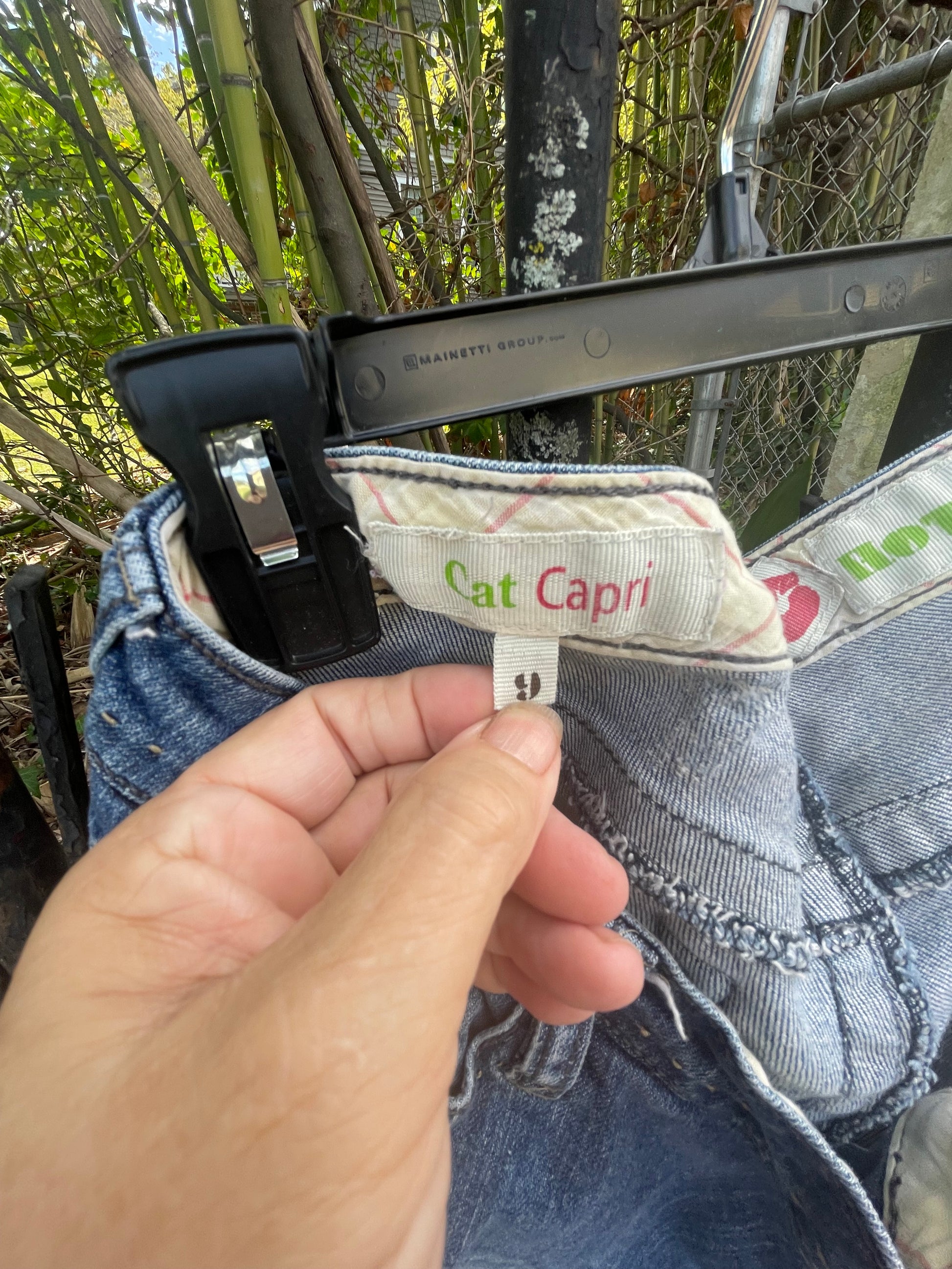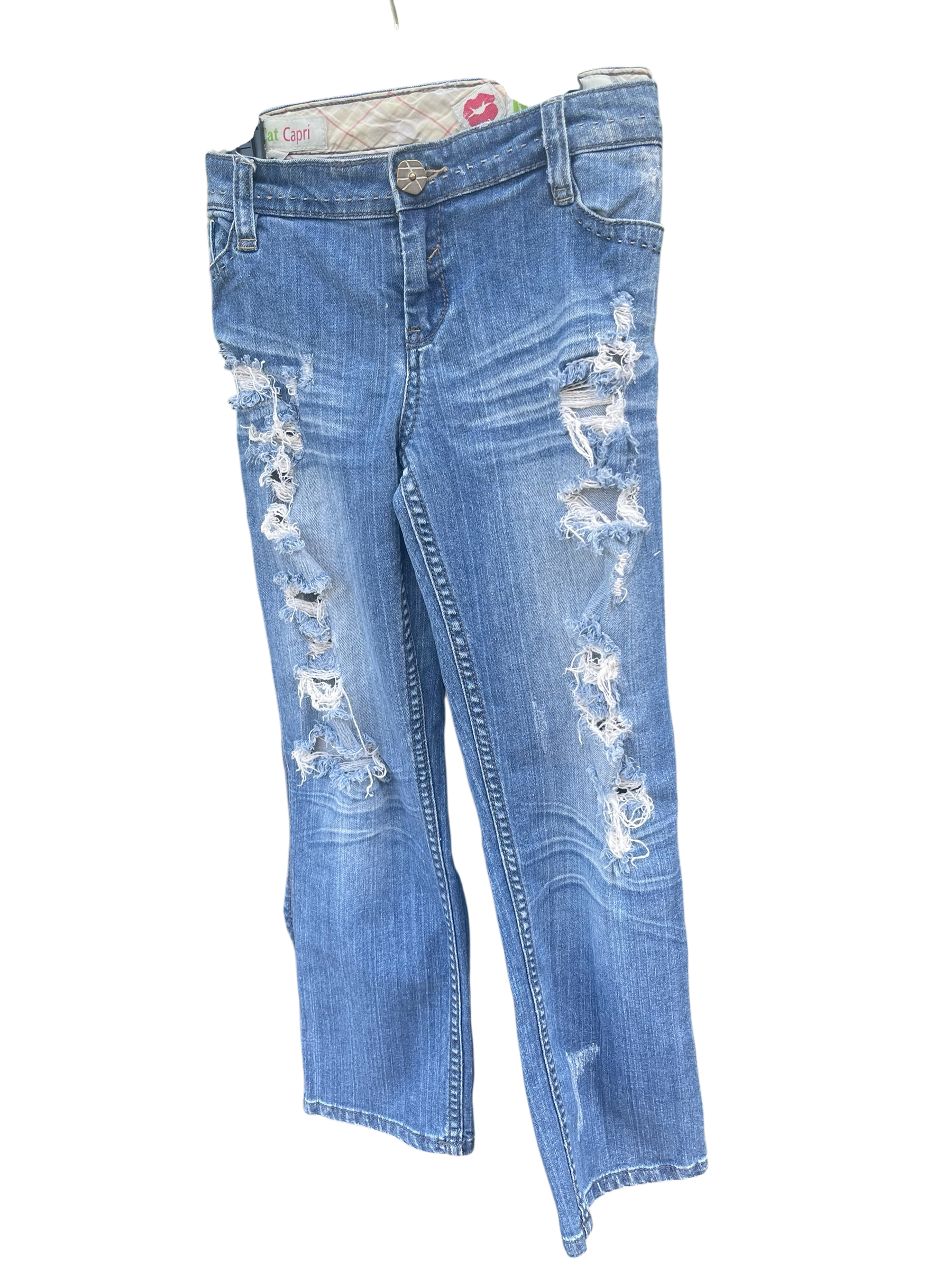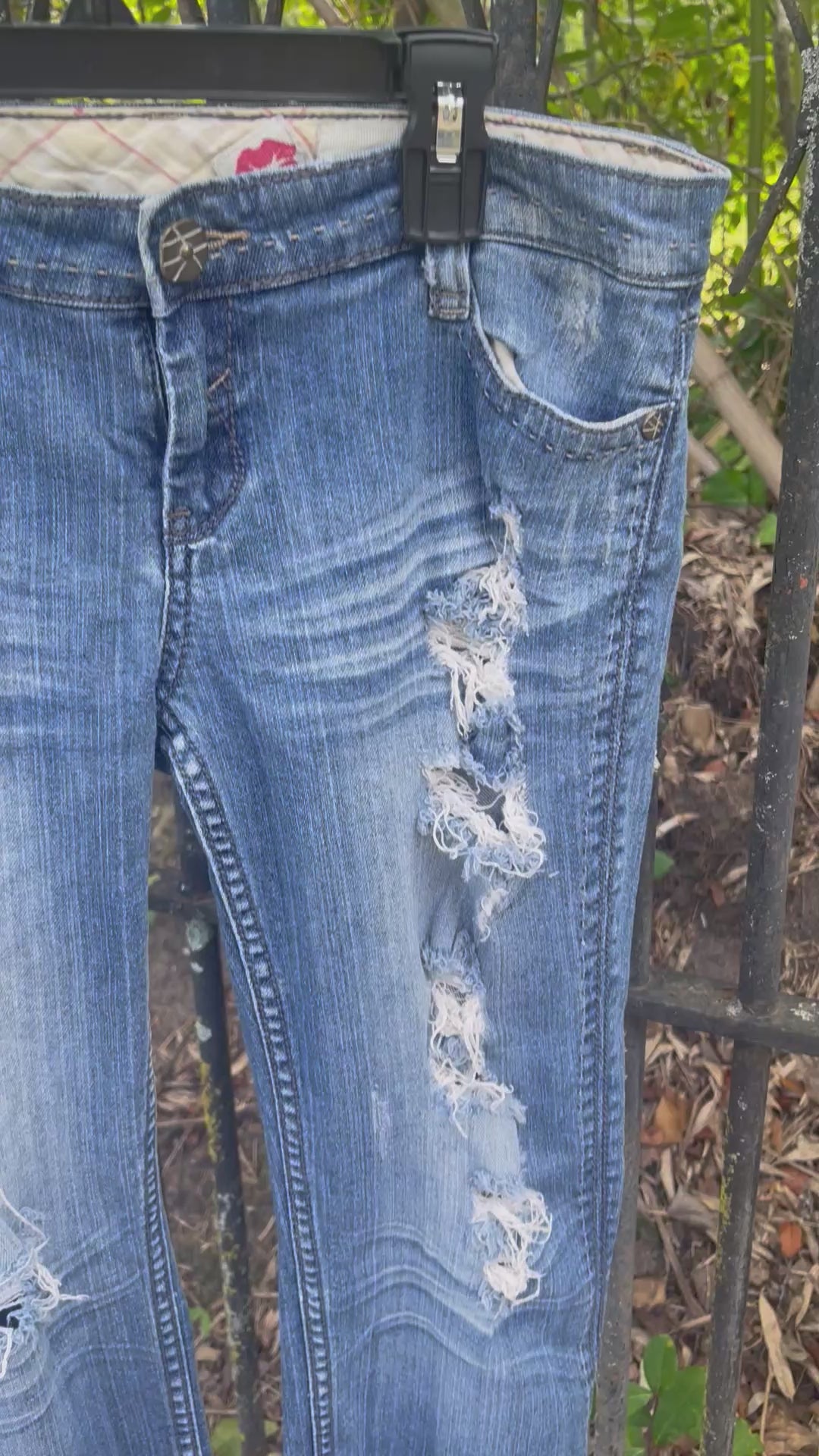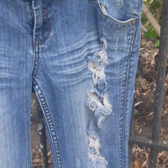 Distressed denim jeans, ankle length jeans, reloved clothing denim