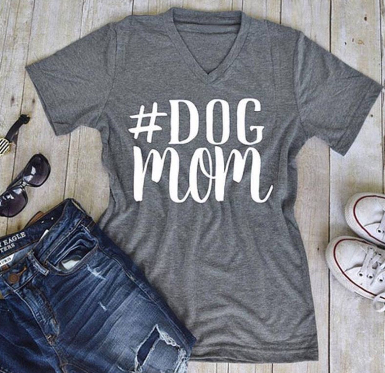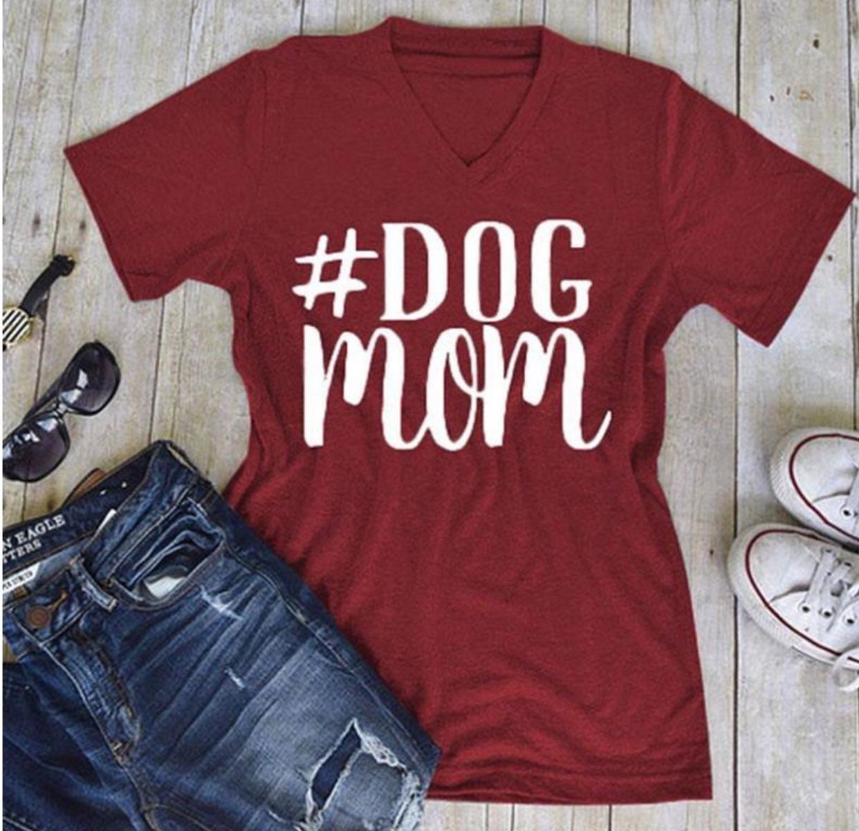 Dog Mom t shirt for every dog lover on your list. This comfy v neck shirt will be the first one you pull out of your drawer. The great Dog Mom graphic combined with soft cotton blend fabric is so comfortable you will want to wear it everyday. This t shirt is a unisex shirt so the fit is nice and roomy. roll the sleeves and give it a french tuck in the front for an updated look. The t shirt is available in maroon, black, navy or gray.