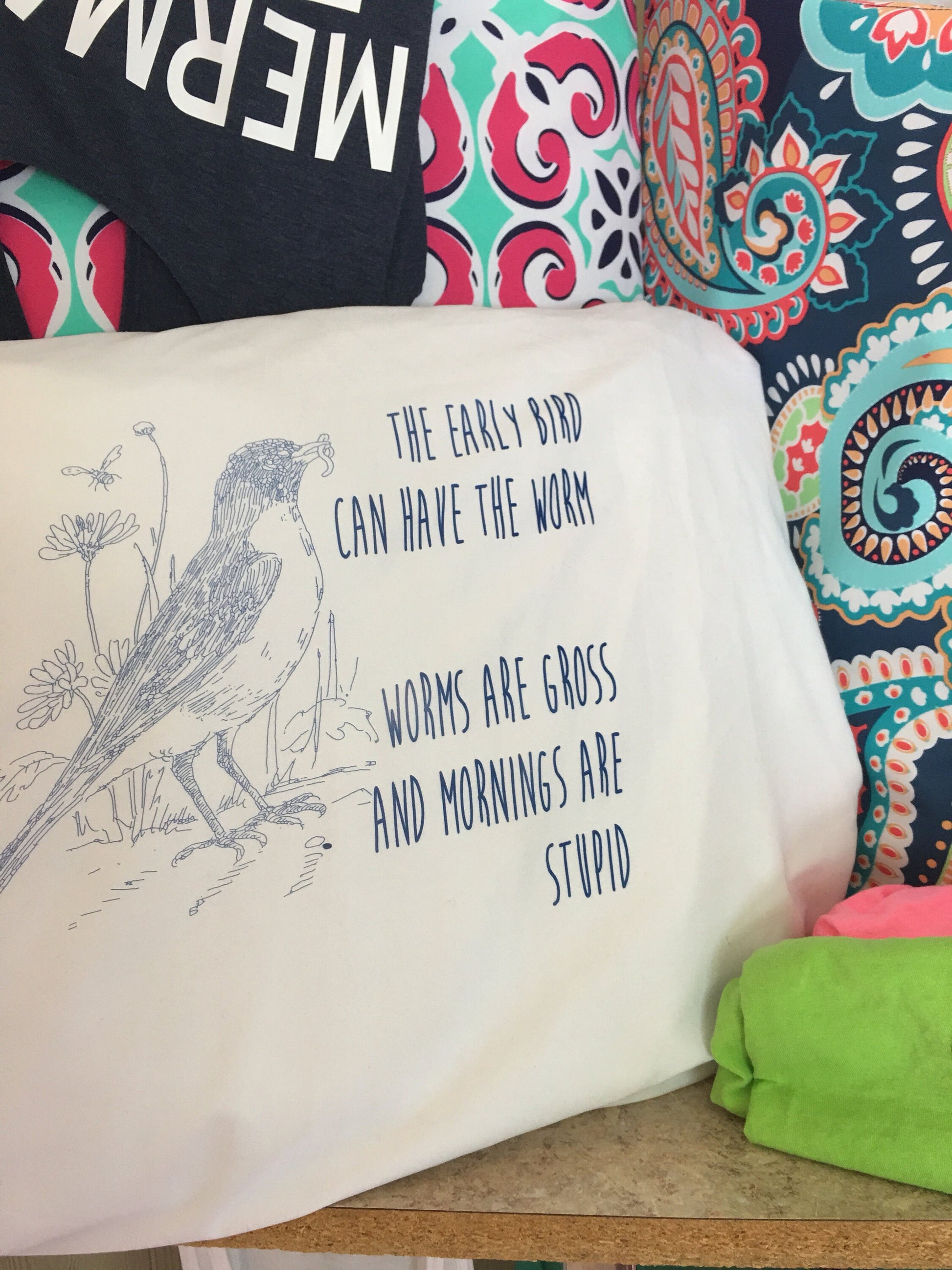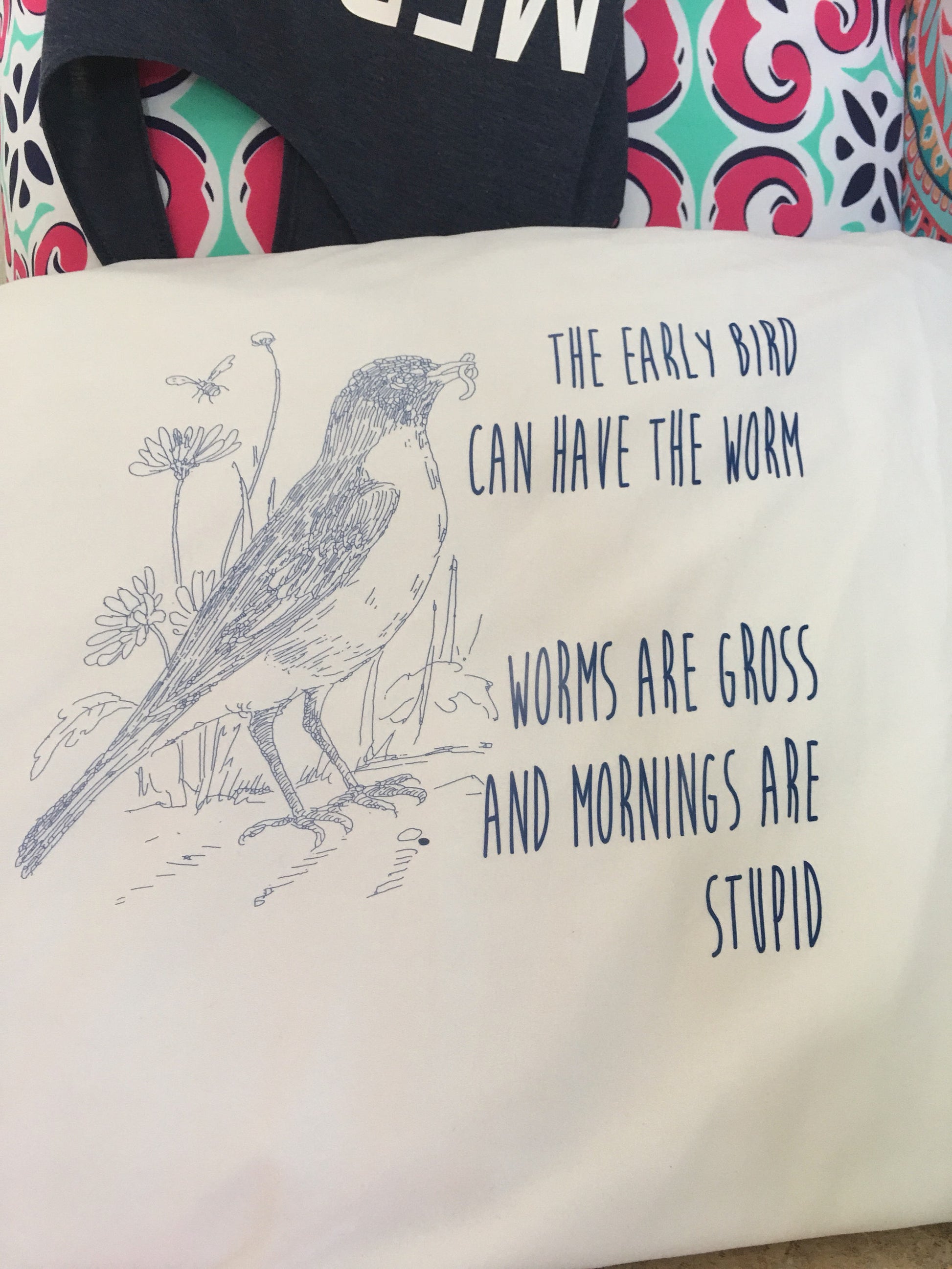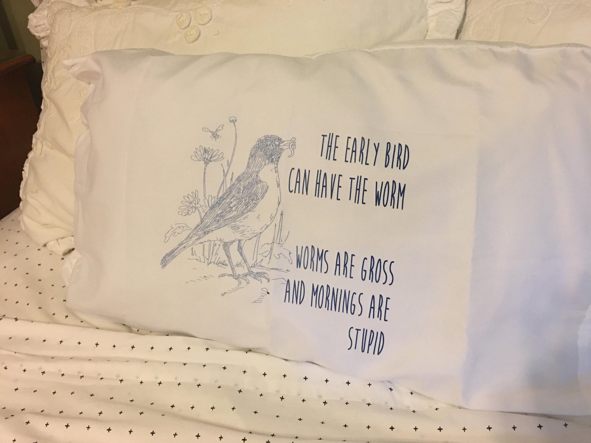 The early bird can have the worm. Worms are gross and mornings are stupid. I am not a morning person so these are always my sentiments. This listing is for one standard size pillow case.