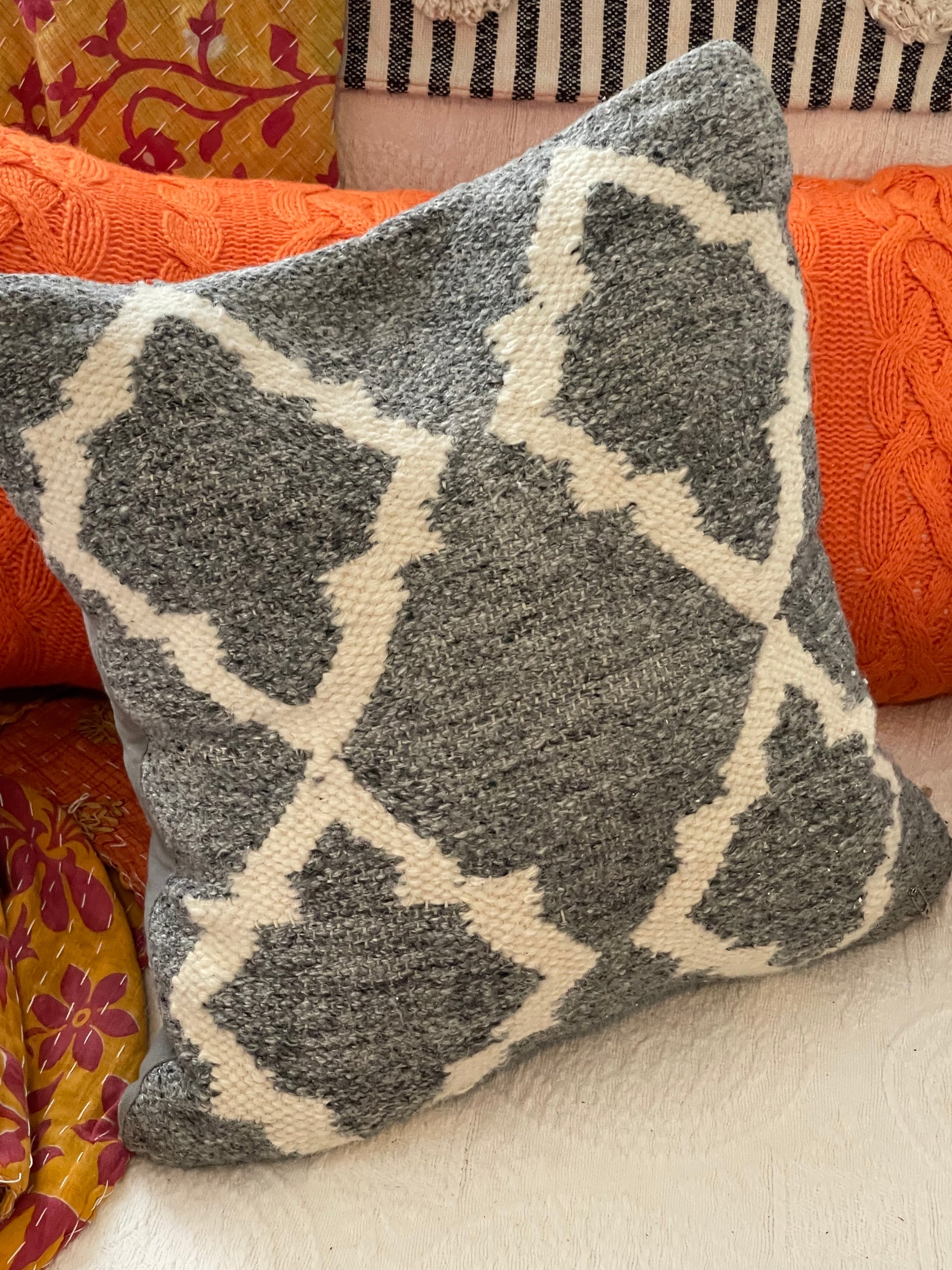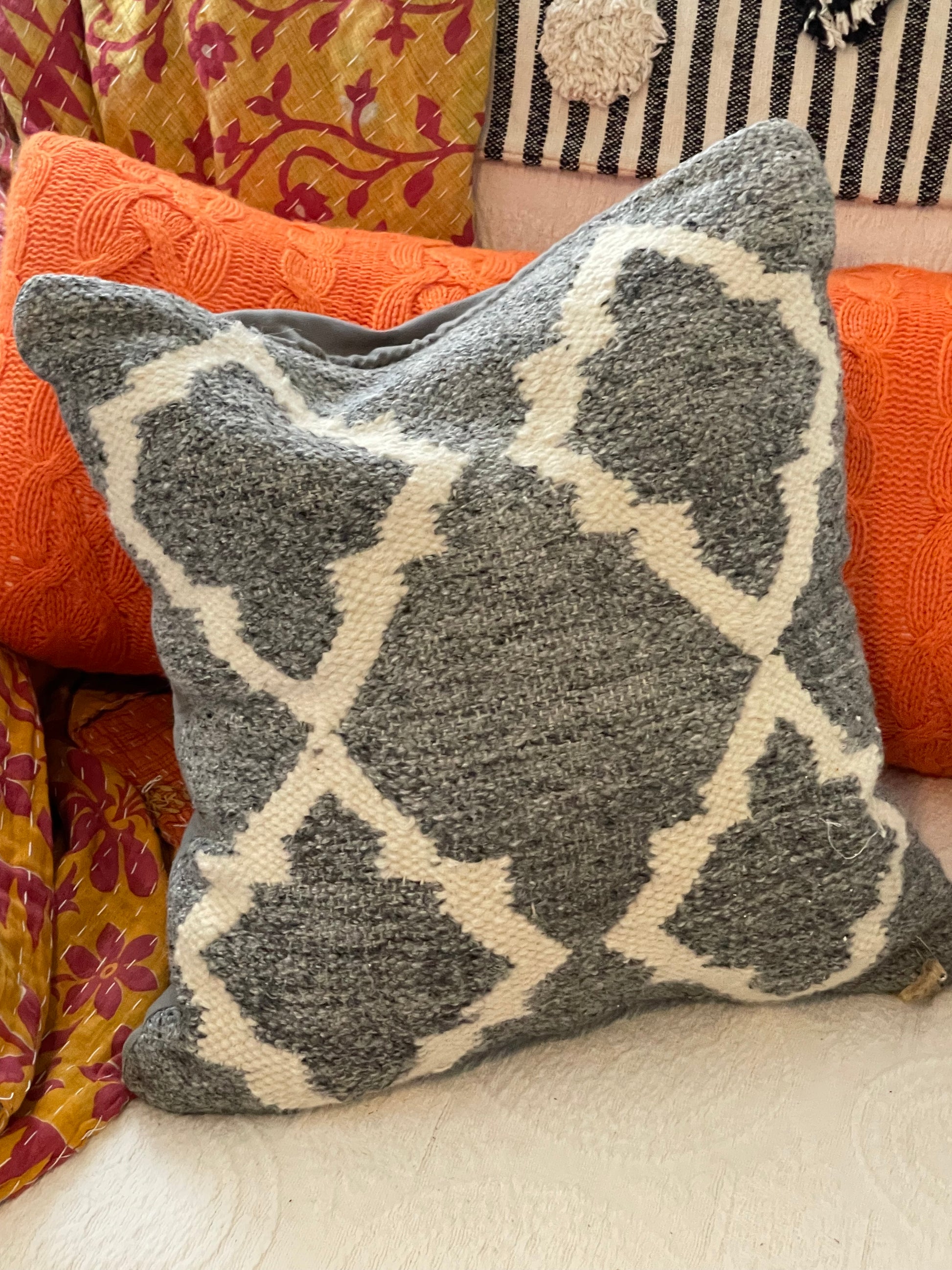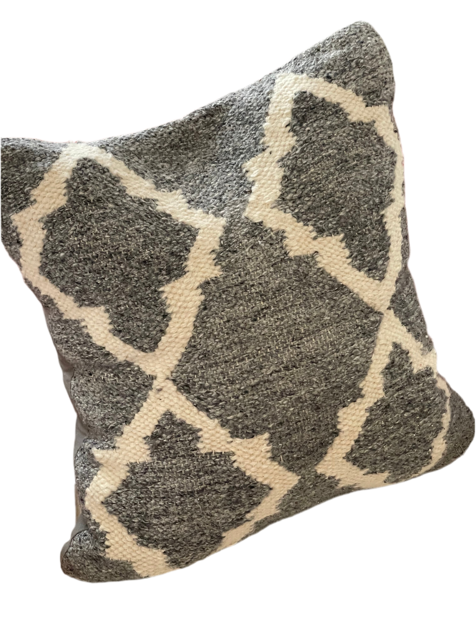 Hand loomed gray poly/wool pillow. Thick vintage hand loomed pillow cover. Your room is not complete until you layer in the texture. Whether you like the eclectic boho look, a completely modern structured room or someplace inbetween this gray and white texture geometric design pillow will add softness and comfort to your room. It is so easy to change seasons and update your home by switching pillows in and out with the season change. This is a one of a kind upcycled sweater pillow. It is 18X18 inches.