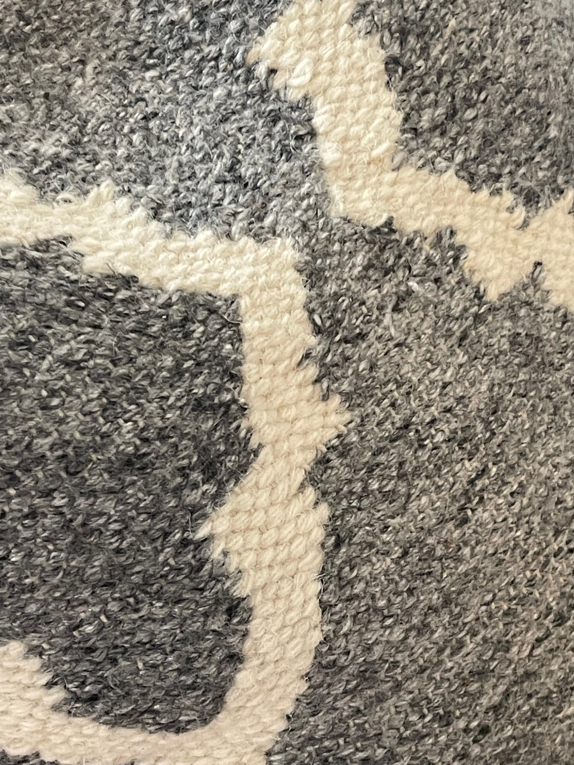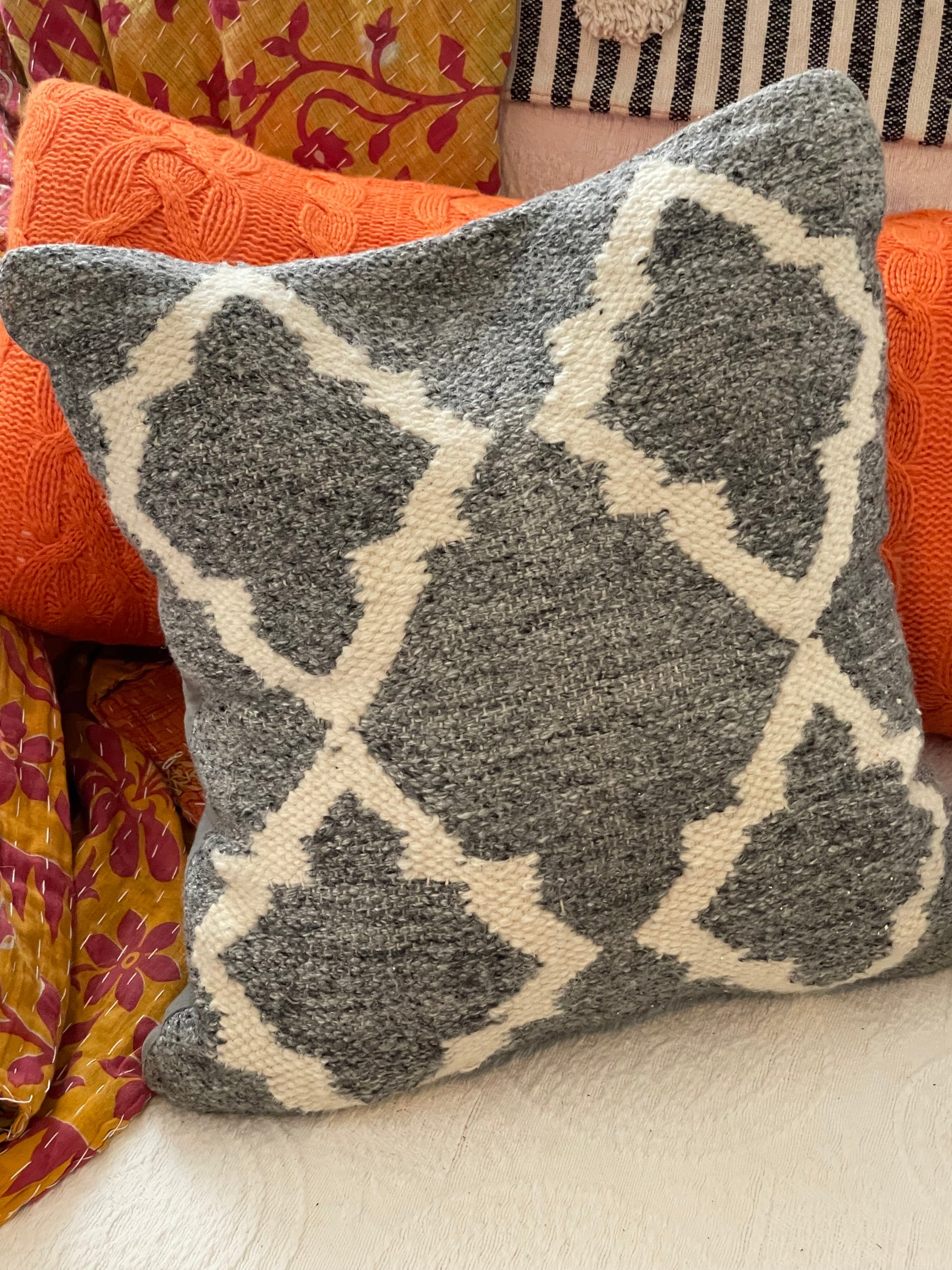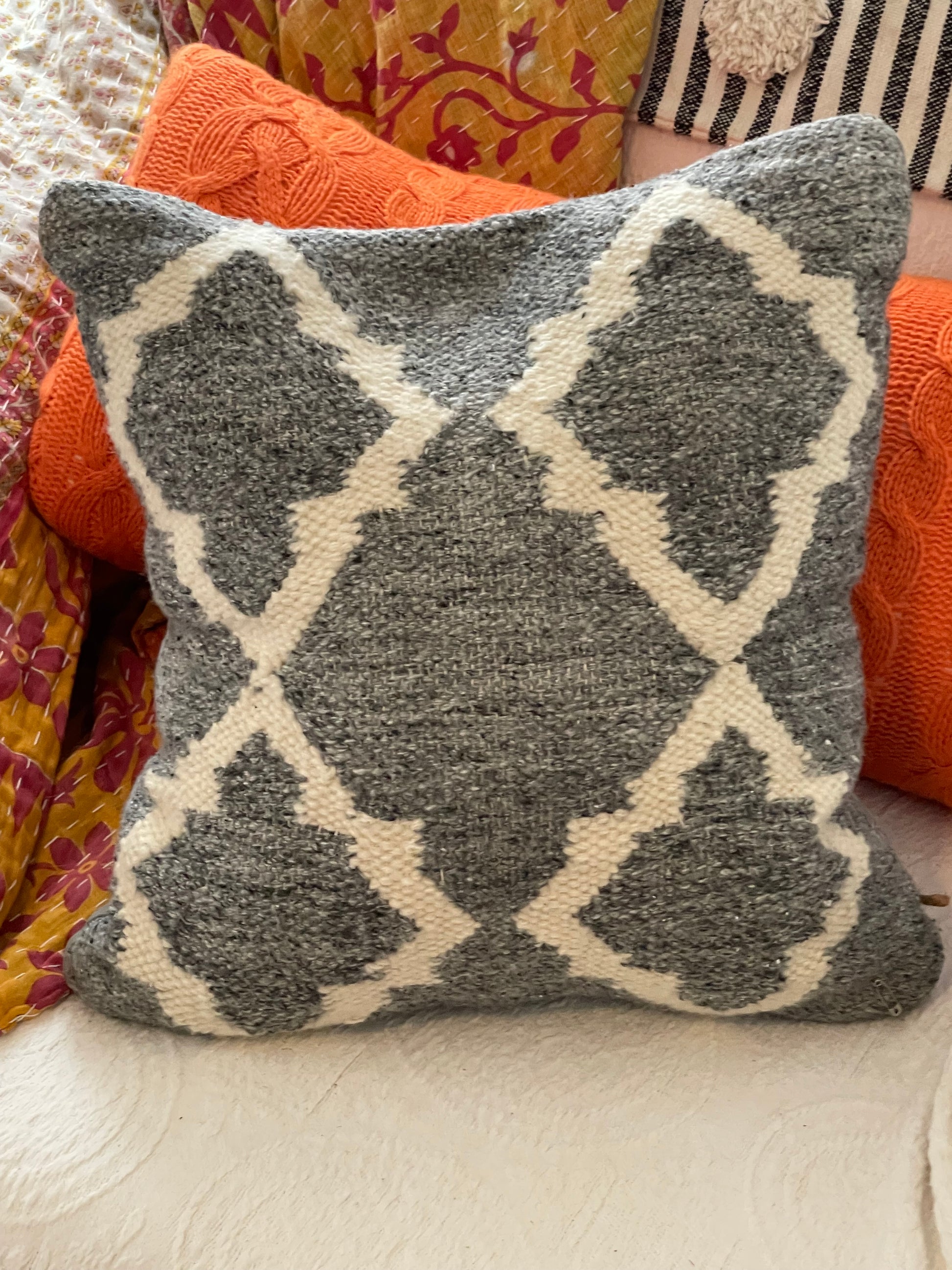 Hand loomed gray poly/wool pillow. Thick vintage hand loomed pillow cover. Your room is not complete until you layer in the texture. Whether you like the eclectic boho look, a completely modern structured room or someplace inbetween this gray and white texture geometric design pillow will add softness and comfort to your room. It is so easy to change seasons and update your home by switching pillows in and out with the season change. This is a one of a kind upcycled sweater pillow. It is 18X18 inches.
