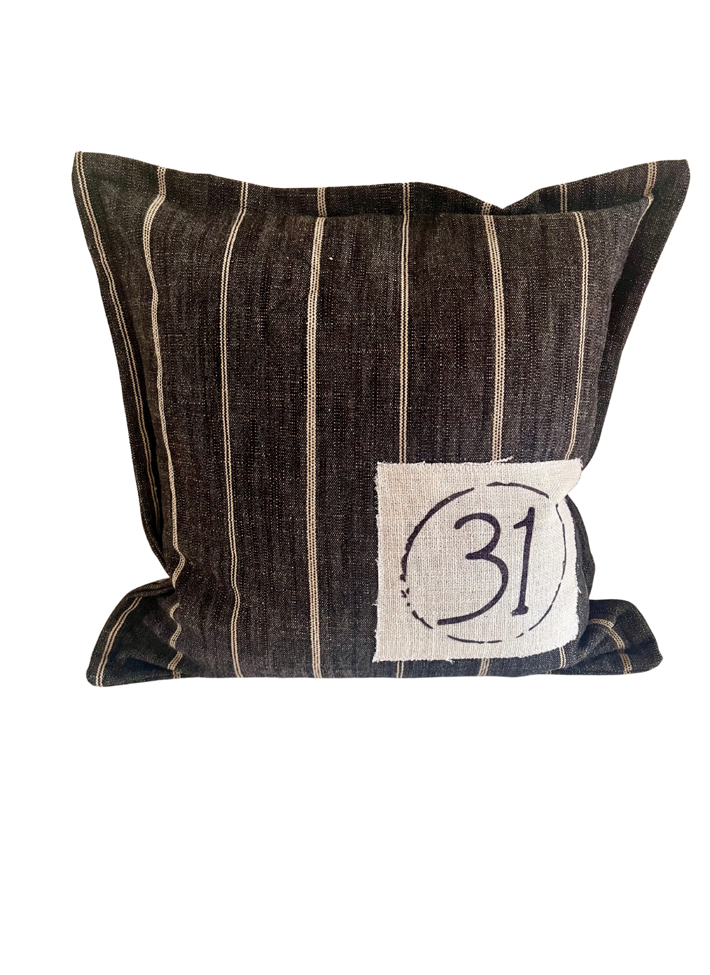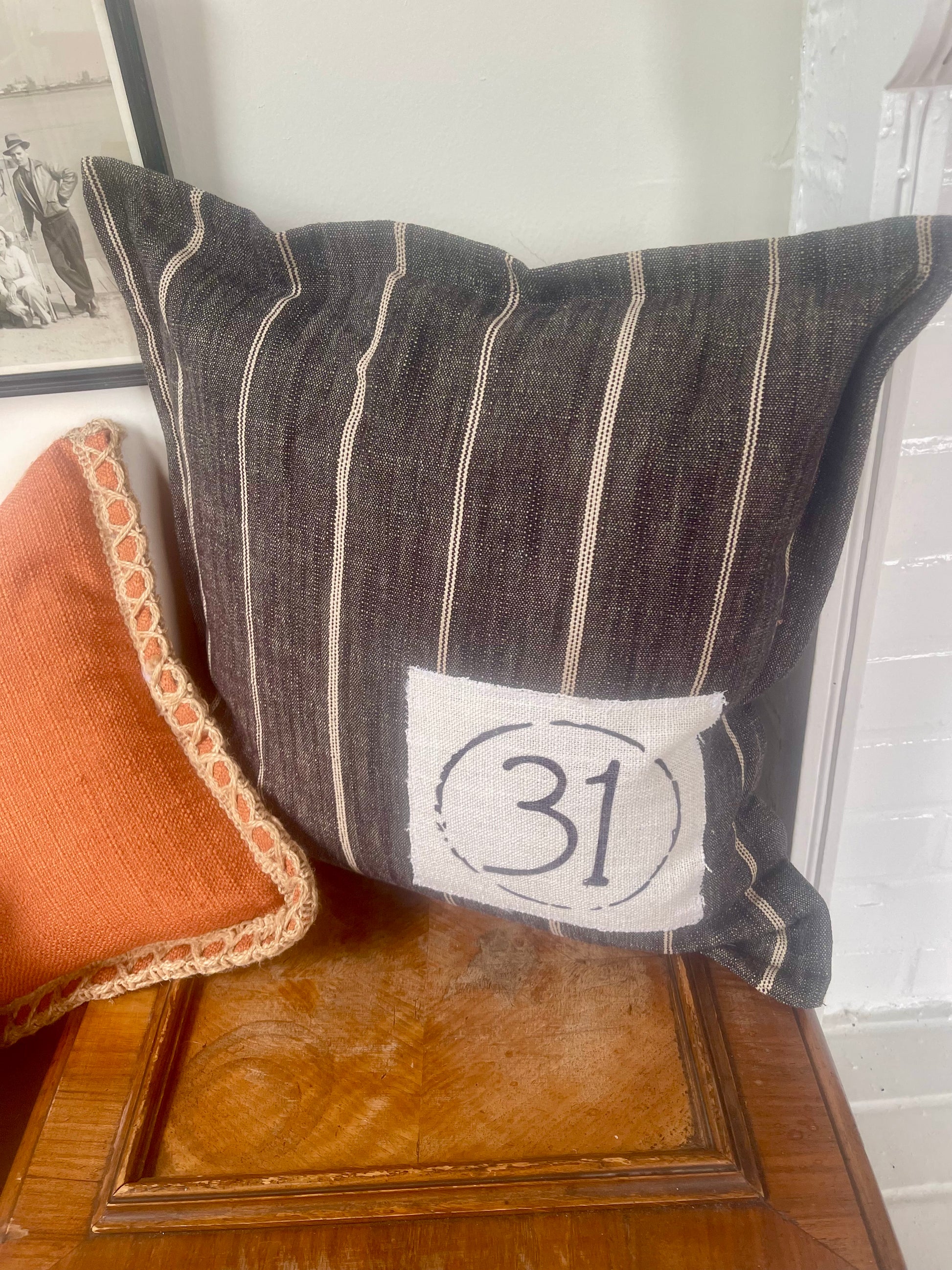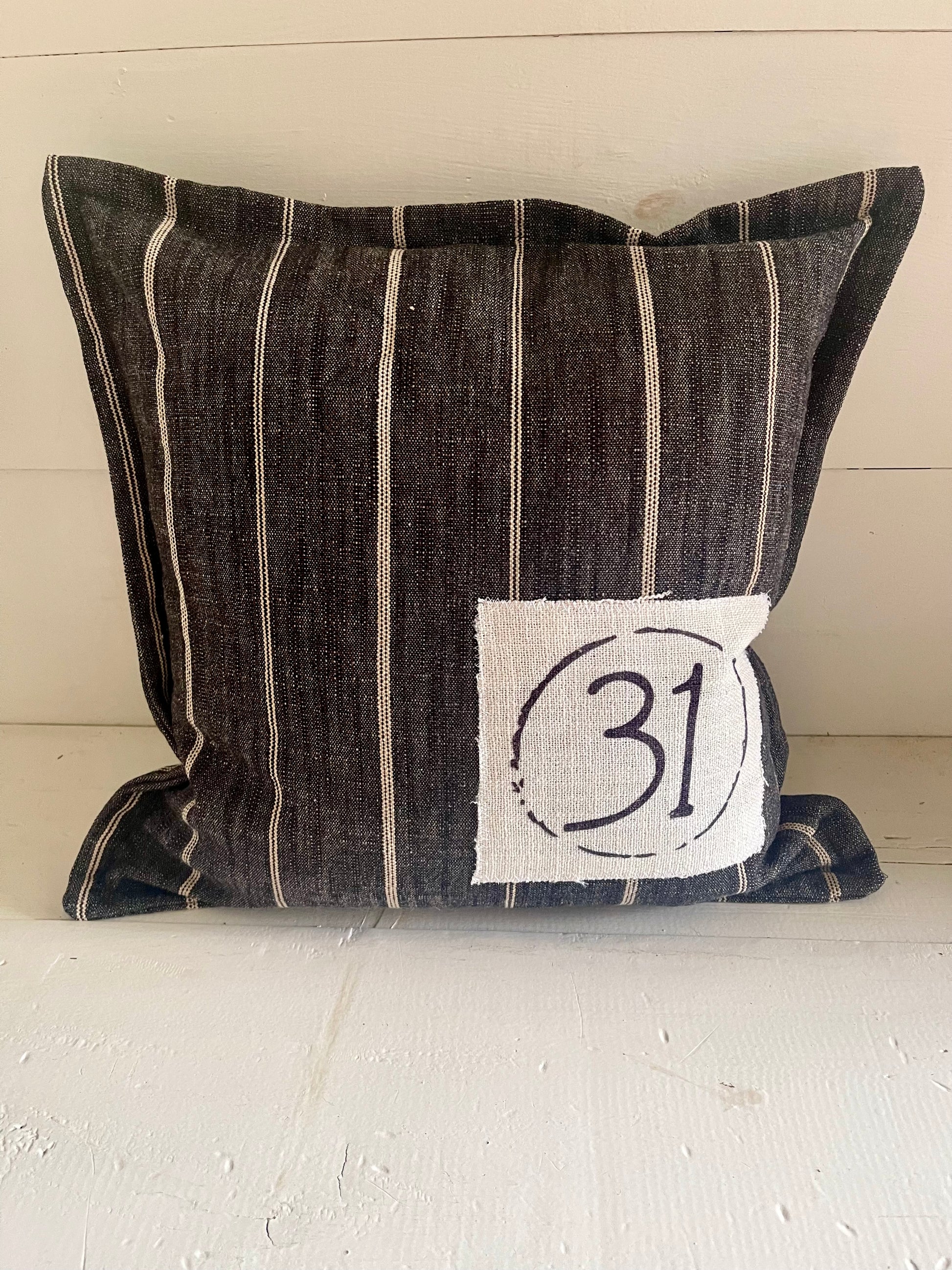 A black ticking stripe pillow with the number 31 on it is a perfect way to layer up your fall decor to celebrate the season. in my own subtle timeless way let’s layer it up and bring on the season!!! we combined a few of our favorite fabrics from our fall vintage collection for you. This vintage fabric ticking stripe in pepper cream square pillow creates the mood perfectly and looks and feels like it was meant for your space. Our Halloween 31 pillow cover will feel right at home in a country farmhouse, a modern loft, a boho eclectic living room, a traditional home, a sea side villa, a rustic cabin… you get the idea, this wonderful layering piece is a great addition to any style home. Not to mention, when transitioning to a fall look it adds to the understated Halloween season without being too