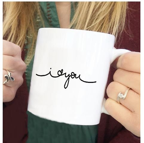 I love you coffee mug. Sweet clean graphics on our white 11 oz. coffee mug. Perfect for your Valentine. This print is completed with a sublimation print. It can easily go in your dishwasher or microwave.
