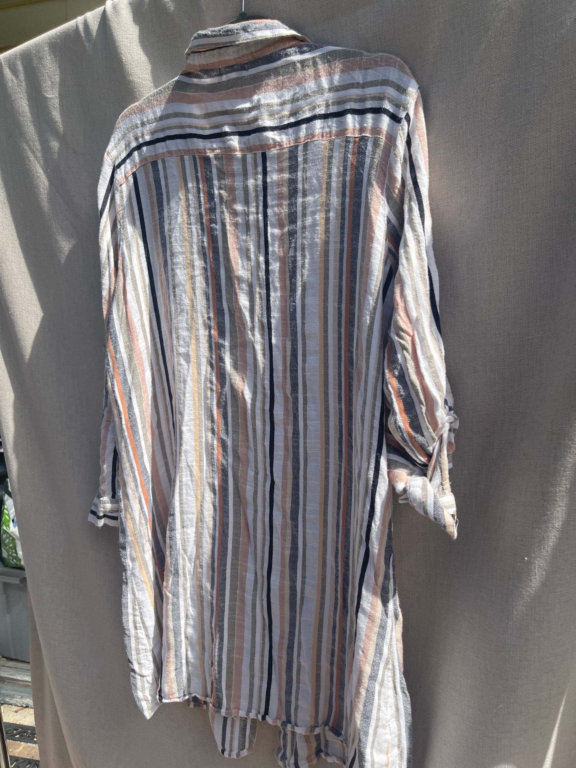 Elevate your style with our gauzy cabana striped tunic shirt lab coat styled jacket! Make a statement and express your fashion sense with this unique piece, inspired by the free-spirited style of Freepeople. Take your wardrobe to the next level.