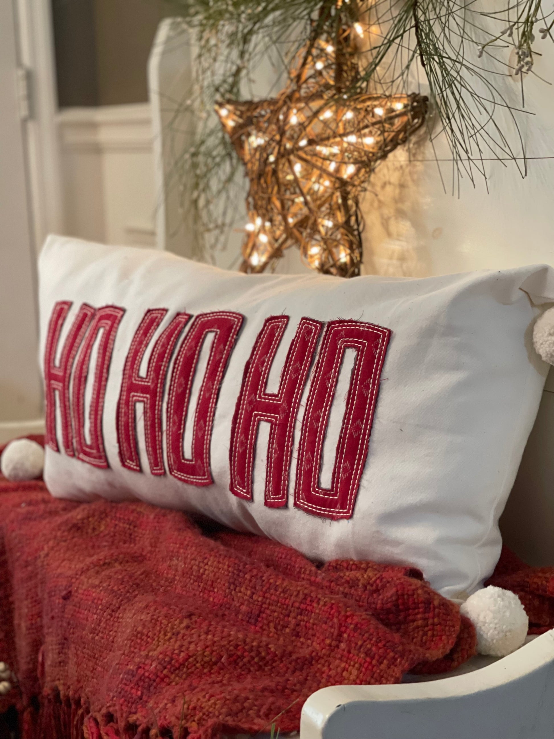 Add a little HO HO HO to your entry way, bedroom , or any other space in your house. This 35 inch long Christmas pillow with appliqued lettering is a fun way to add a little holiday spirit. The applique lettering has a rag edge to it so your pillow looks comfortably from the moment you unbox it. made with soft white duck canvas it will hold up to the most rugged pillow fights. a zipper closure makes it easy to wash when needed. White fluffly pom poms accent all 4 corners.