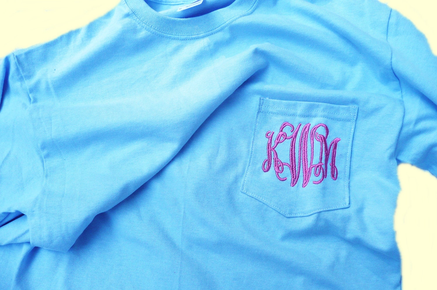 Monogrammed pocket t shirts. new t shirts in great new colors. with a monogrammed pocket. Personalize your pocket. Choose from the round monogram style or the entwined monogram style. These shirts are boy cut and come in sizes small, medium, large and extra large. most colors are 100% cotton. You can choose any color embroidery thread for your t shirt. To place an order all I need to know is what color t shirt you would like, what color thread, and your monogram initials and size. This monogram is sewn through the pocket.
