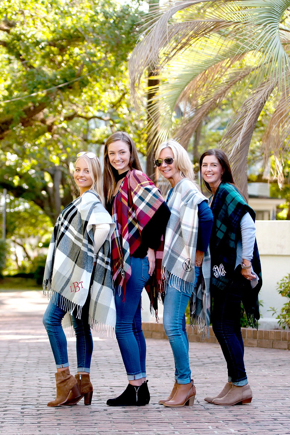 Wonderfully cozy paid shawls and monogrammed wraps.
