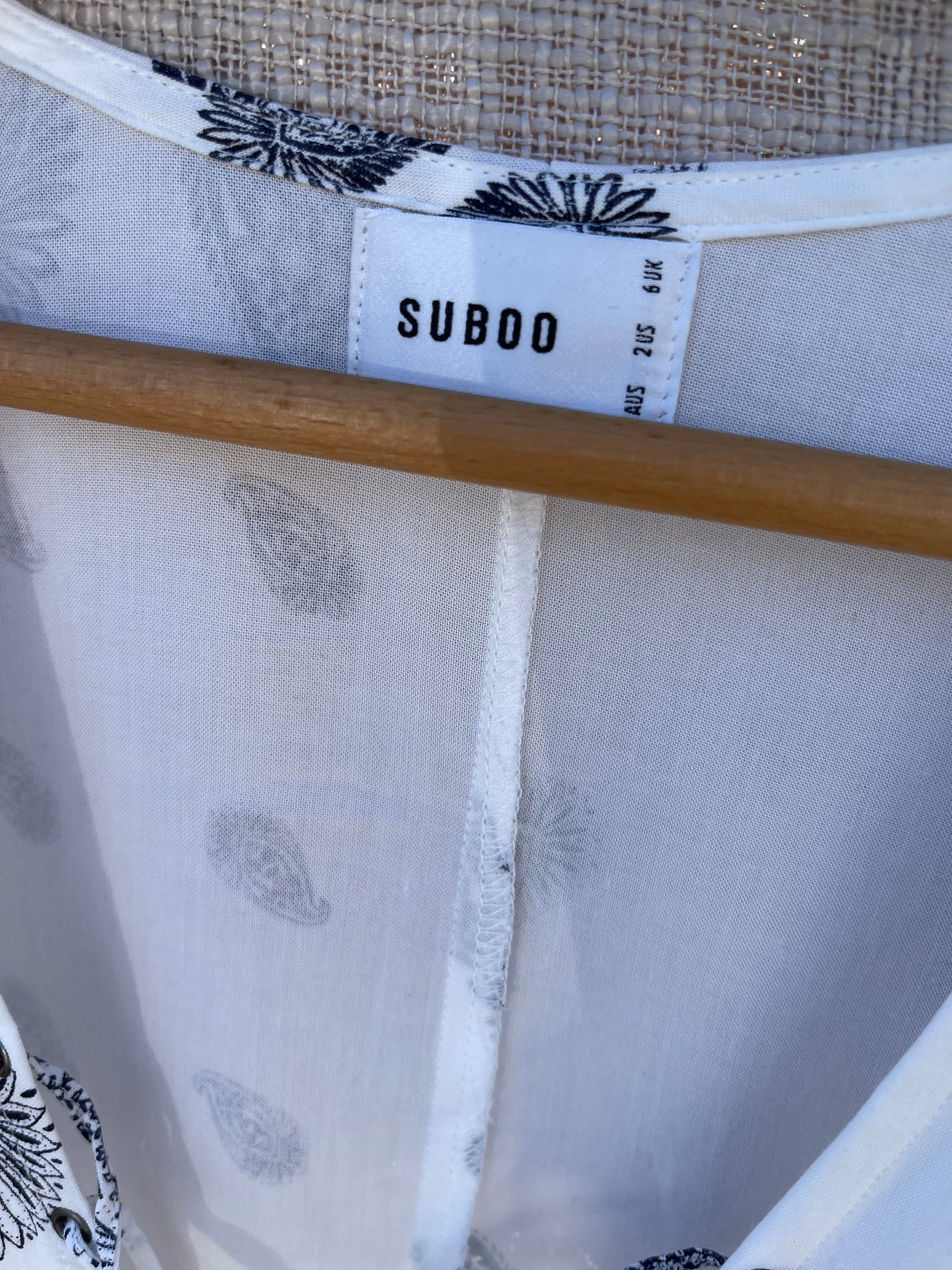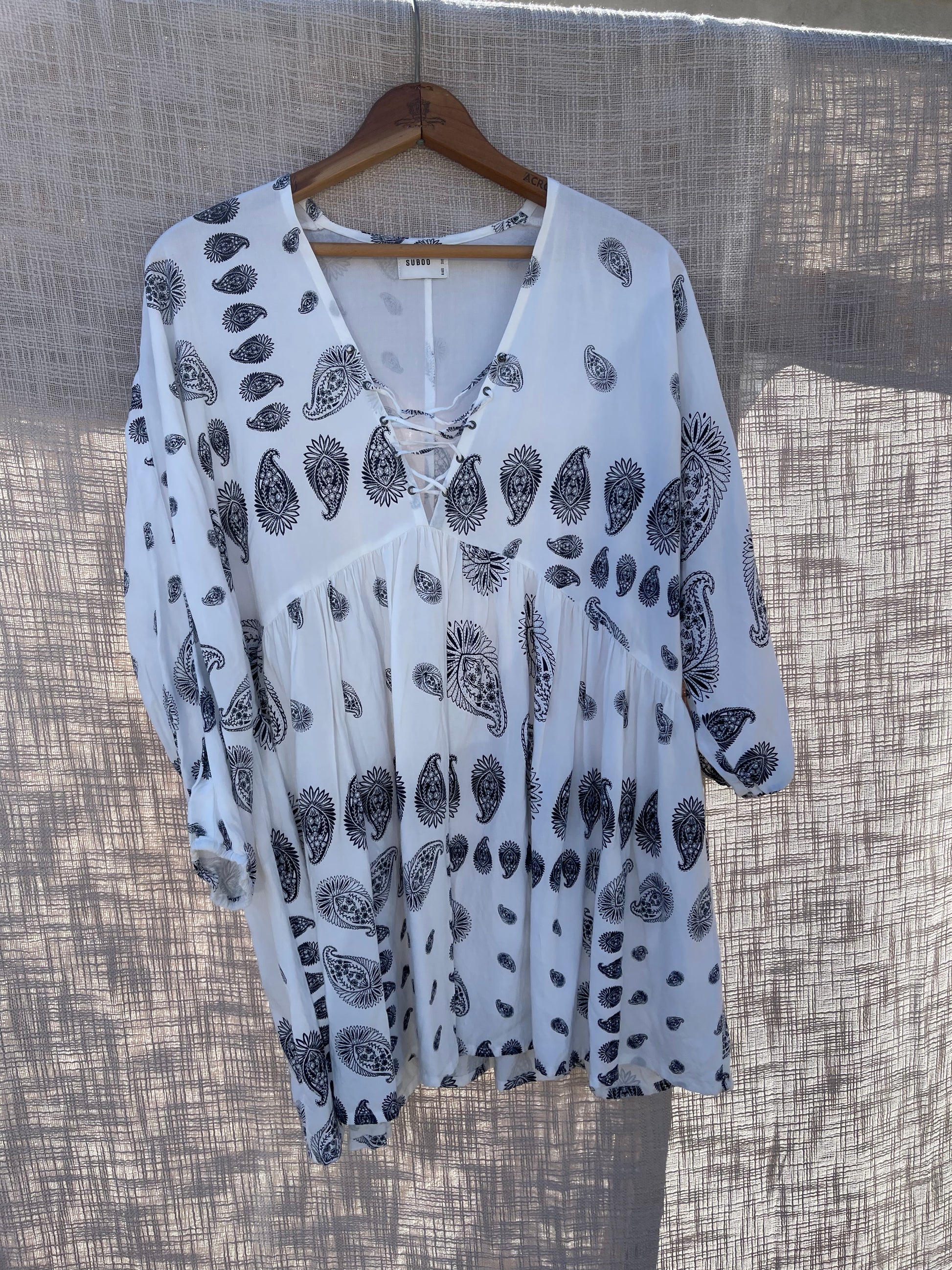 White paisley Flowy top with the front lace up closure we love this top to wear with jeans or even over a bathing suit . Create your own style and be true to yourself,. Clothes should make you feel great and happy and pretty and it what your wearing doesn’t then put it in the discard pile. Changing up your closet does not have to be expensive especially not with our gently used collection of hand picked clothes