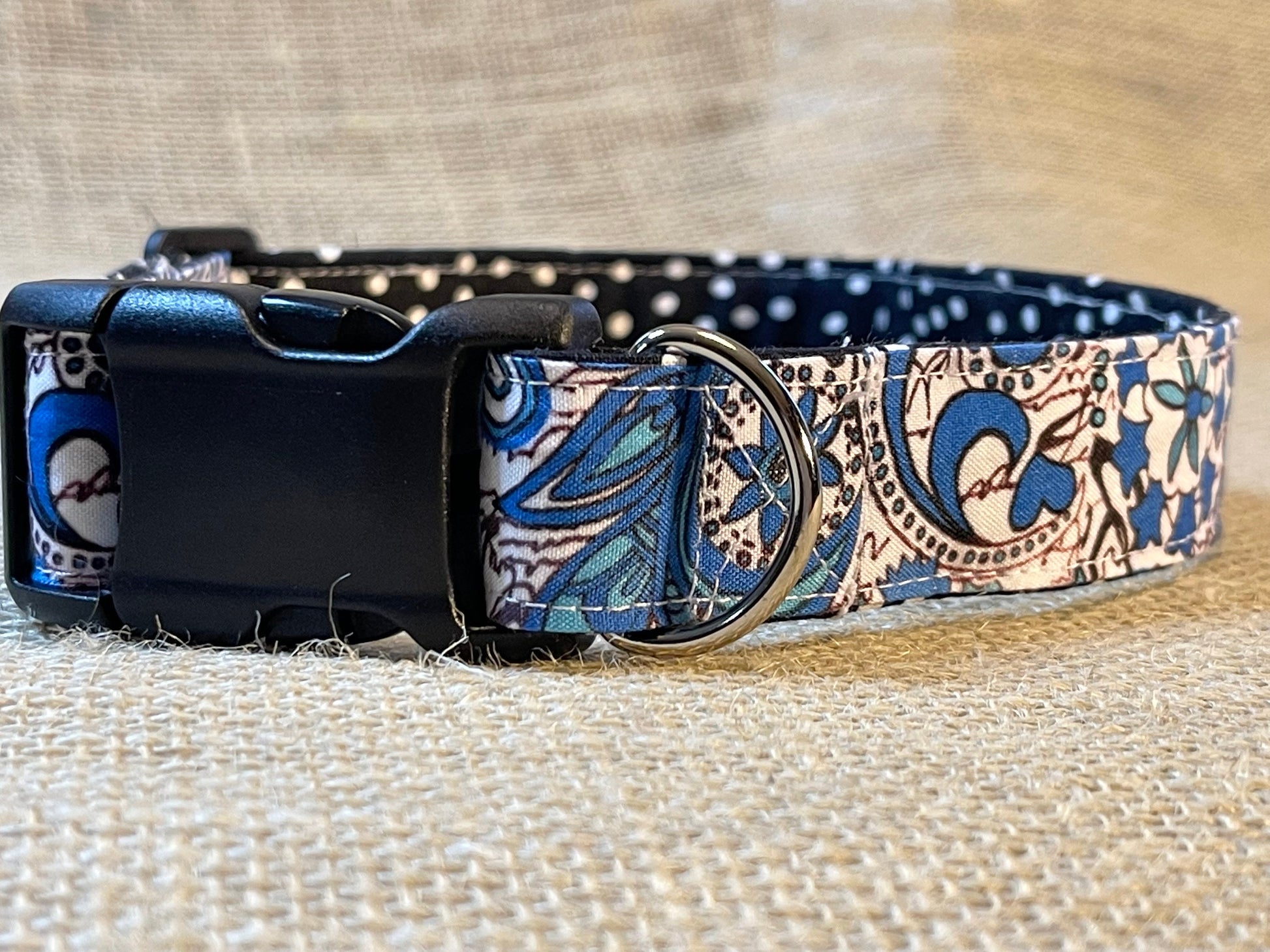 Peace signs and paisley dog collar. All of my collars are made using 2 layers of coordinating fabric with a webbing layer in between. Durable and sturdy yet soft on your dogs neck. Every collar is fully washable. This dog collar utilizes a quick clasp closure, also called a side release clasp. Sizing is given as a range of neck lengths. Measure your dogs neck size or its current collar length (not including buckles) to obtain correct sizing.