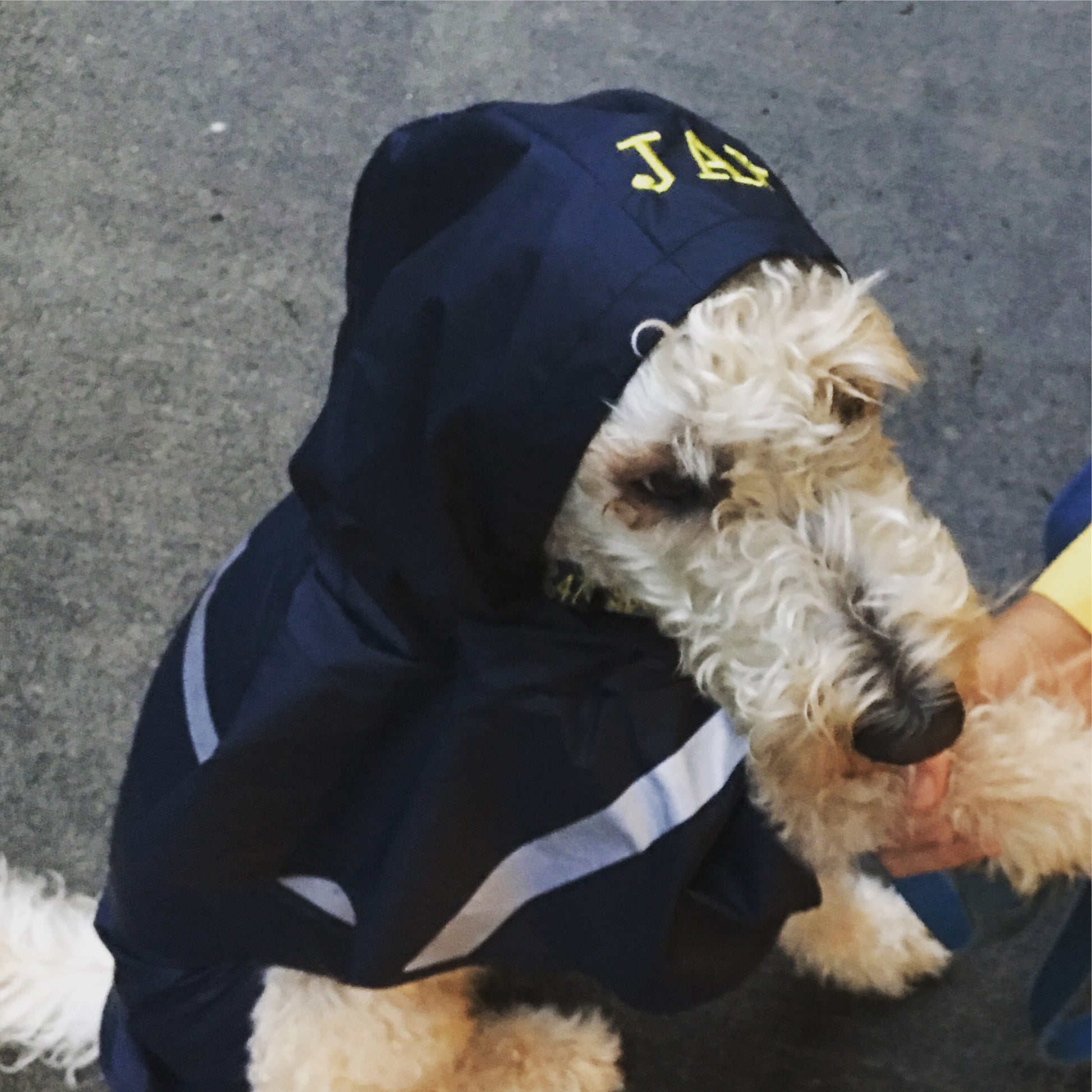Reflective dog raincoat, keeps your dog warm and dry. The reflective tape on the back is perfect for visibility on a rainy night. This raincoat helps especially with curly haired dogs to keep their fur from getting matted