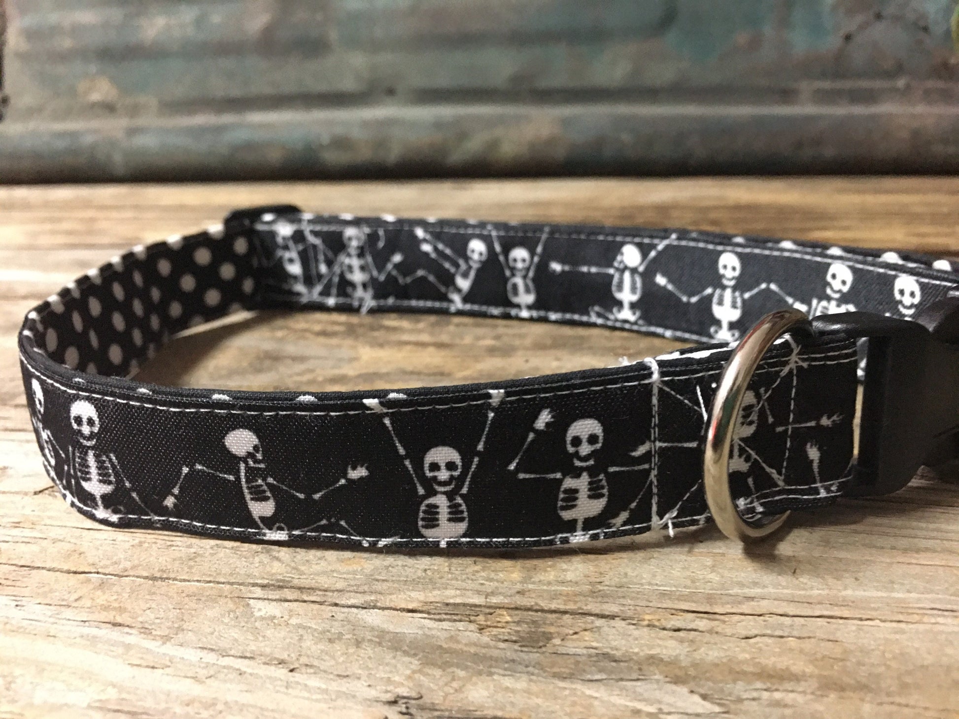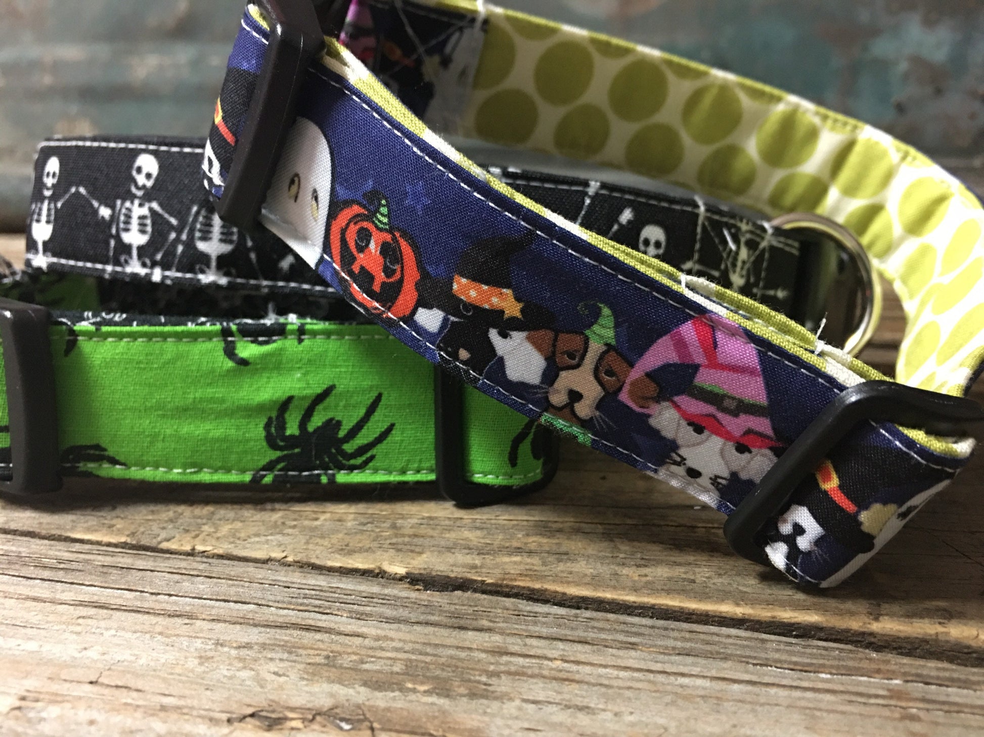 Golblins, and skeletons and spiders oh my! Spooky scary and cute Halloween dog collars for your favorite pooch. Choose between spiders, dancing skeletons, goblins, Halloween parade, or orange and black stripes
