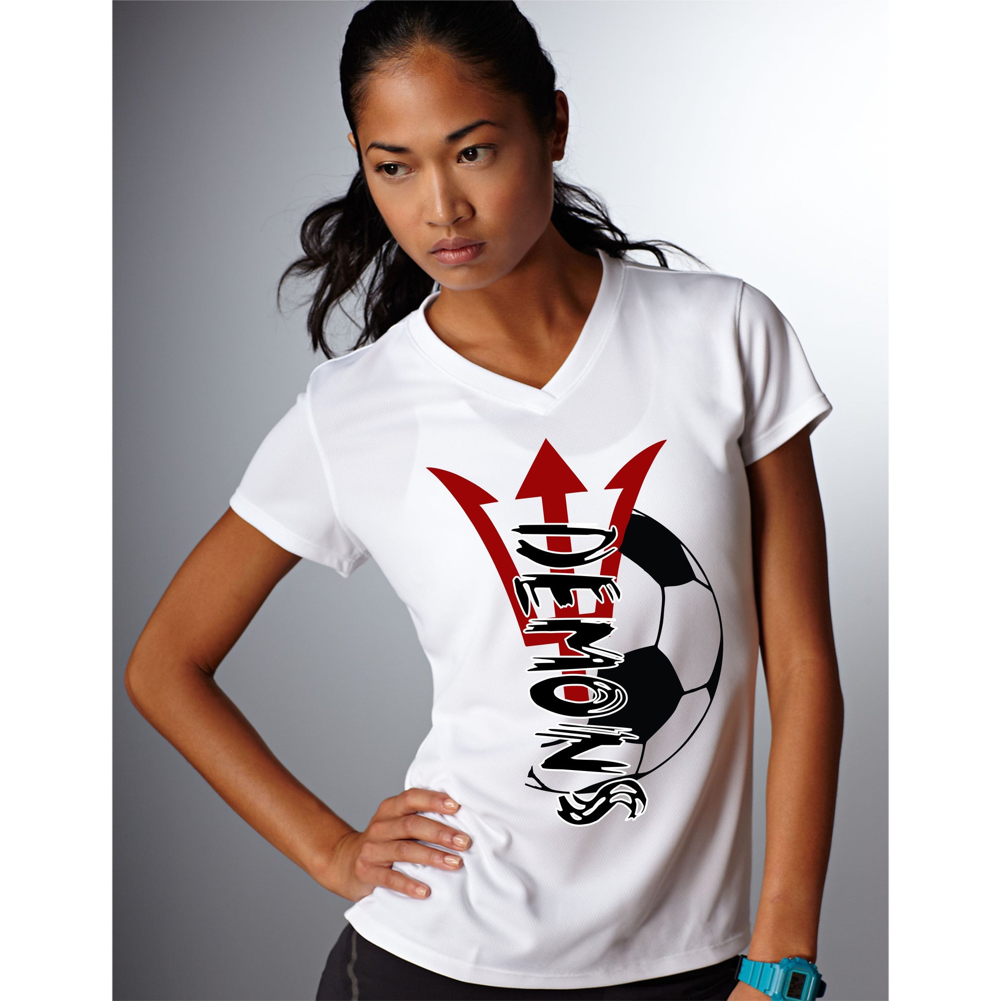 V neck performance shirt with a great Warner Robins Demon soccer graphic. Show your team spirit with this ladies sizes v neck performance shirt. Moisture wicking performance wear.