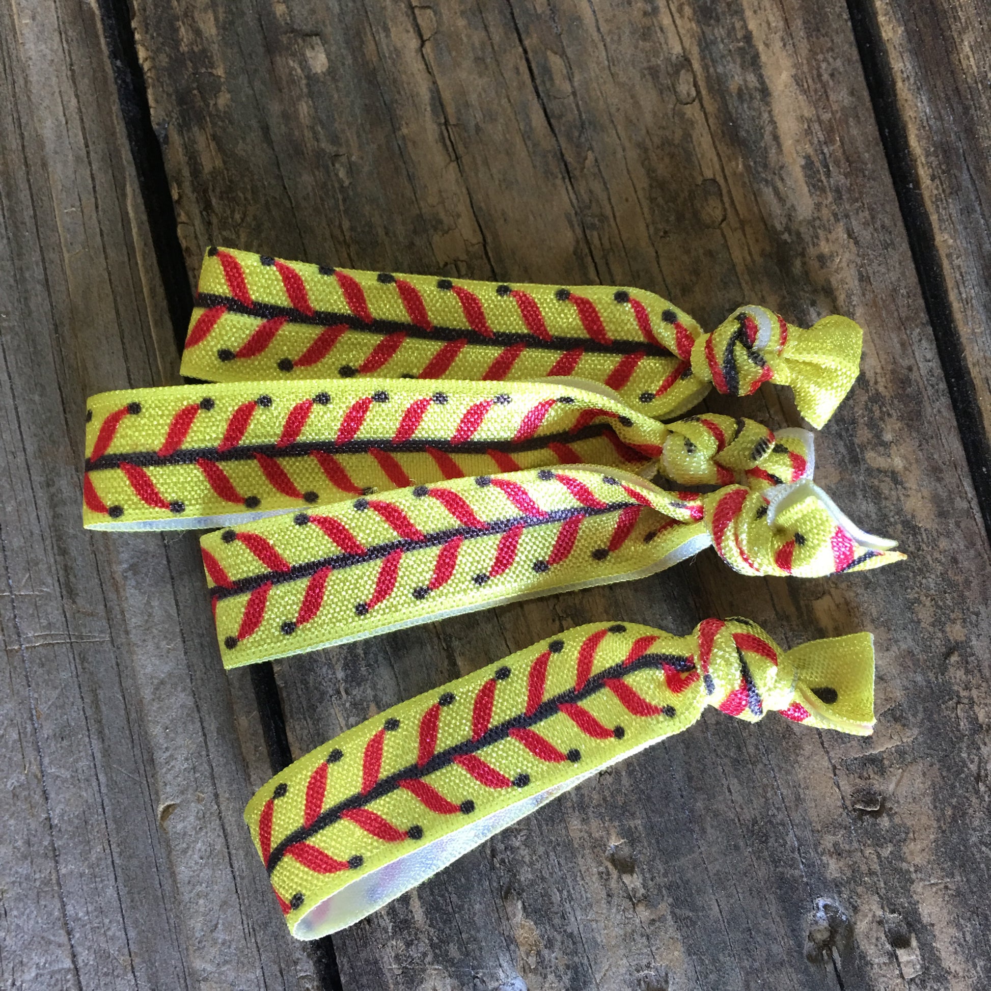 Softball hair ties.yellow with red laces. Soft elastic will not get tangled in your hair. Keep your ponytail in place, no slip. pick your quantity from a set of 4- a set of 24. Your discount increases with qty.
