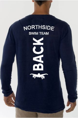 swim team graphic t shirt. Long sleeve t shirt with the name of your stroke on the back. Personalized with your team name on the front. Perfect for medley relay teams or just for your favorite stroke.