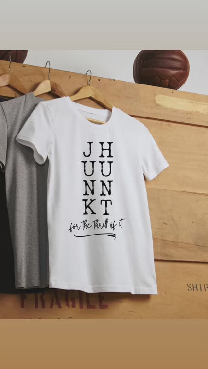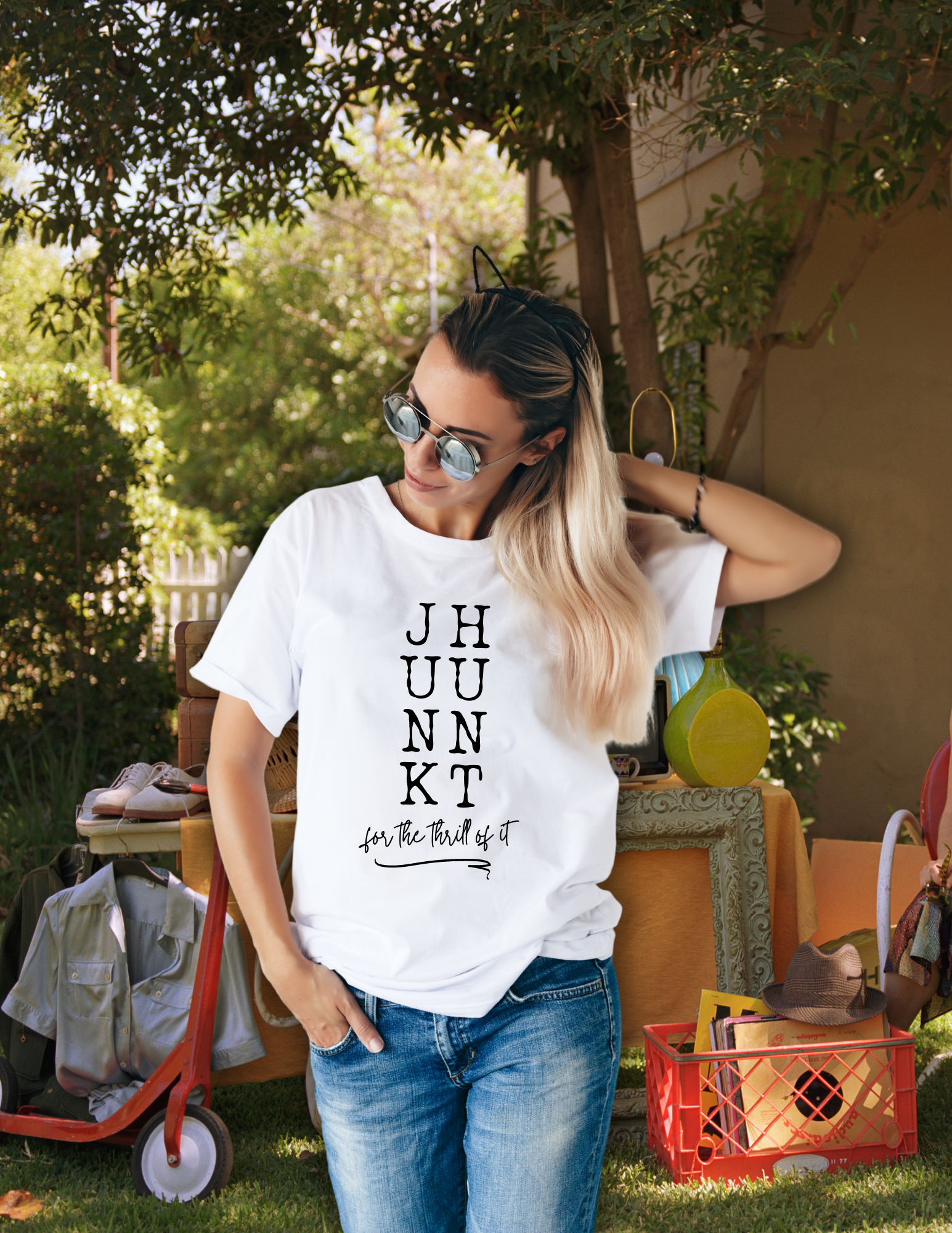 are you a junk hunter? Does the estate sale sign at the corner make your palms sweat and your heart race? Join the club and own it. Vintage is where your soul lIves. Junk sales are the perfect place to start treasure hunting. We have the perfect t shirt for your day. Graphic t-shirts for the vintage lover at heart. This deconstructed raw edged t shirt is roomy, comfortable soft and stylish. It has that broken in feel right from the start. We deconstructed the neckline, sleeves and bottom edge to let the natural fibers roll into perfection for an upscale look.