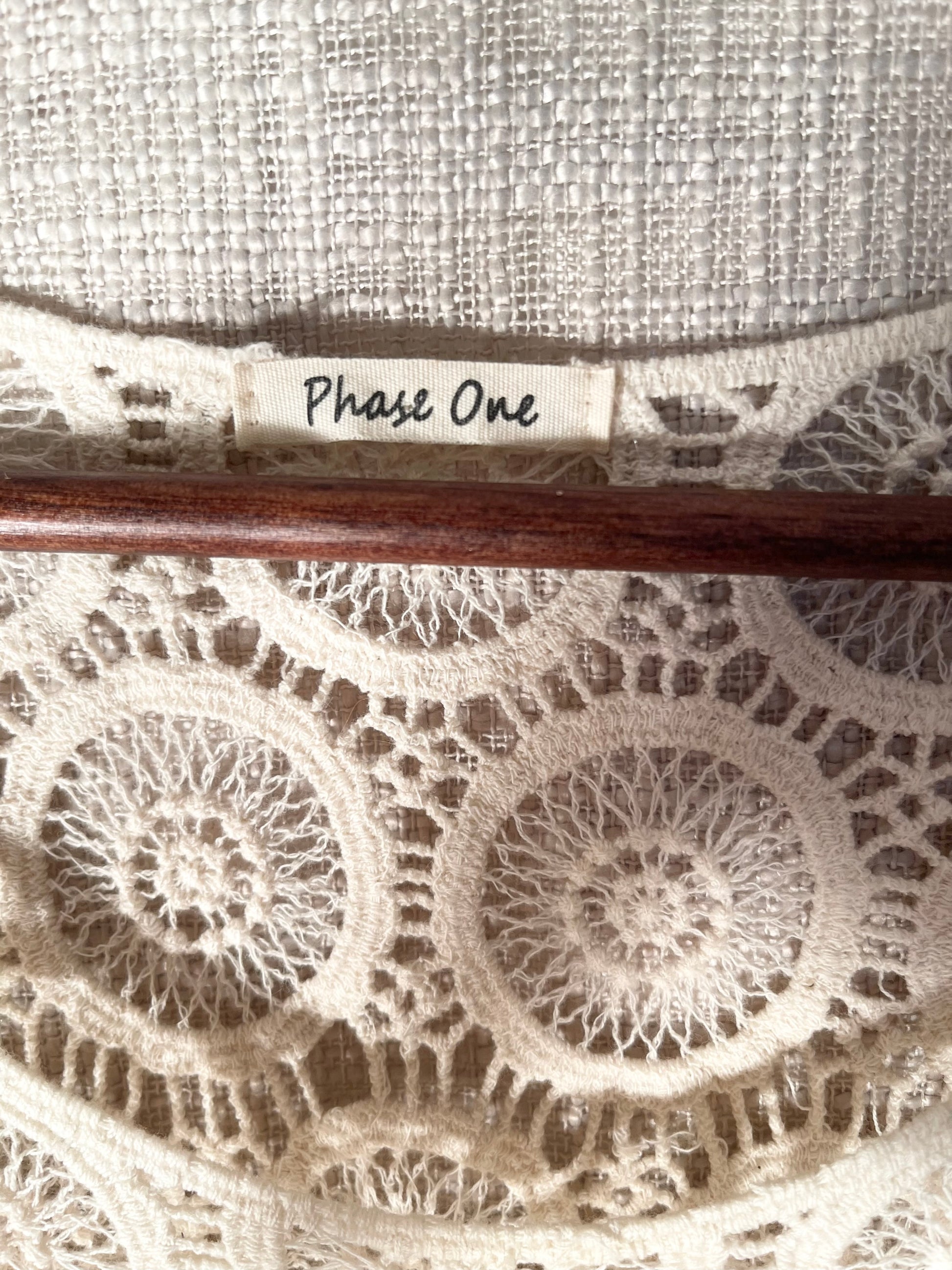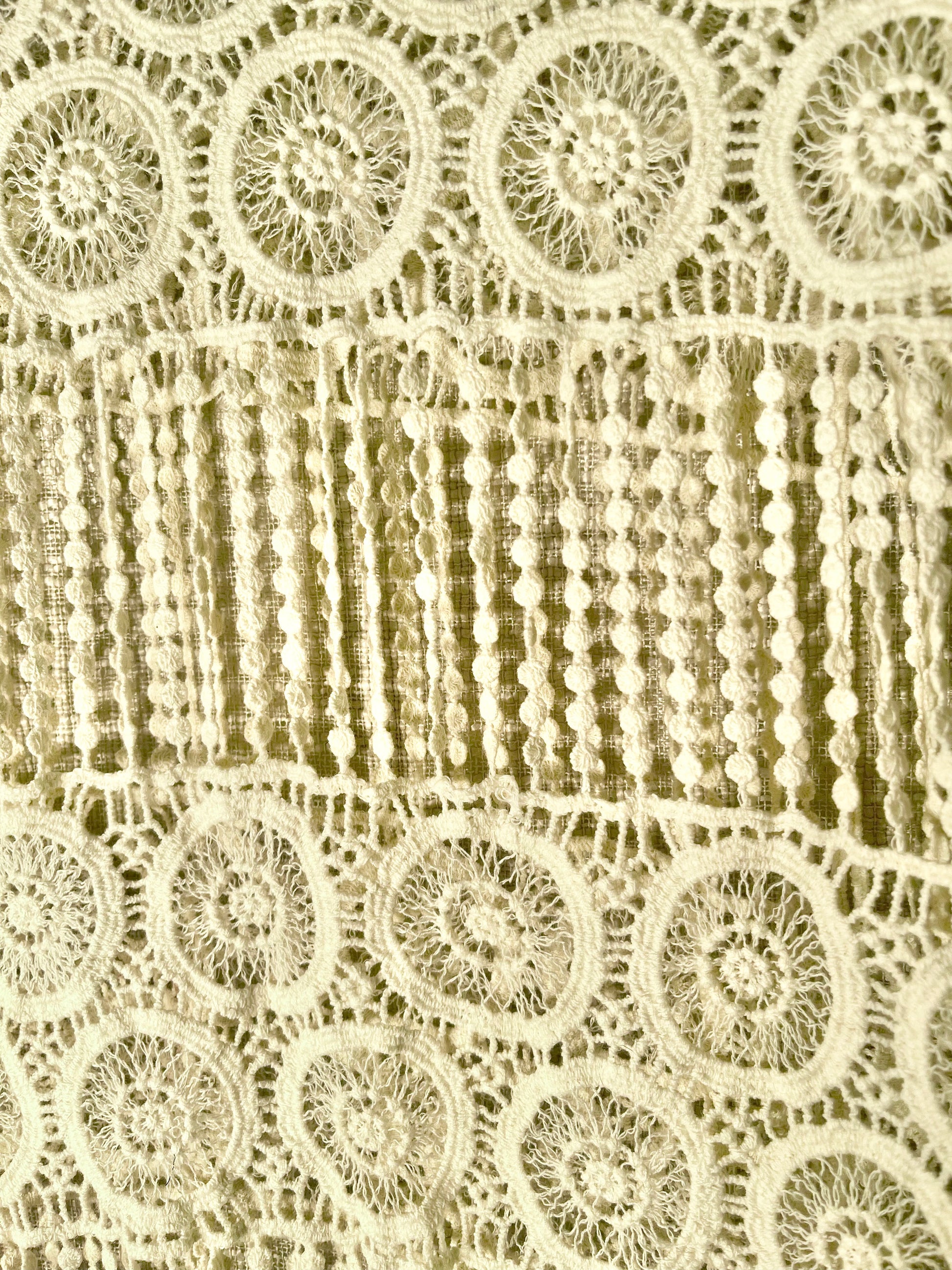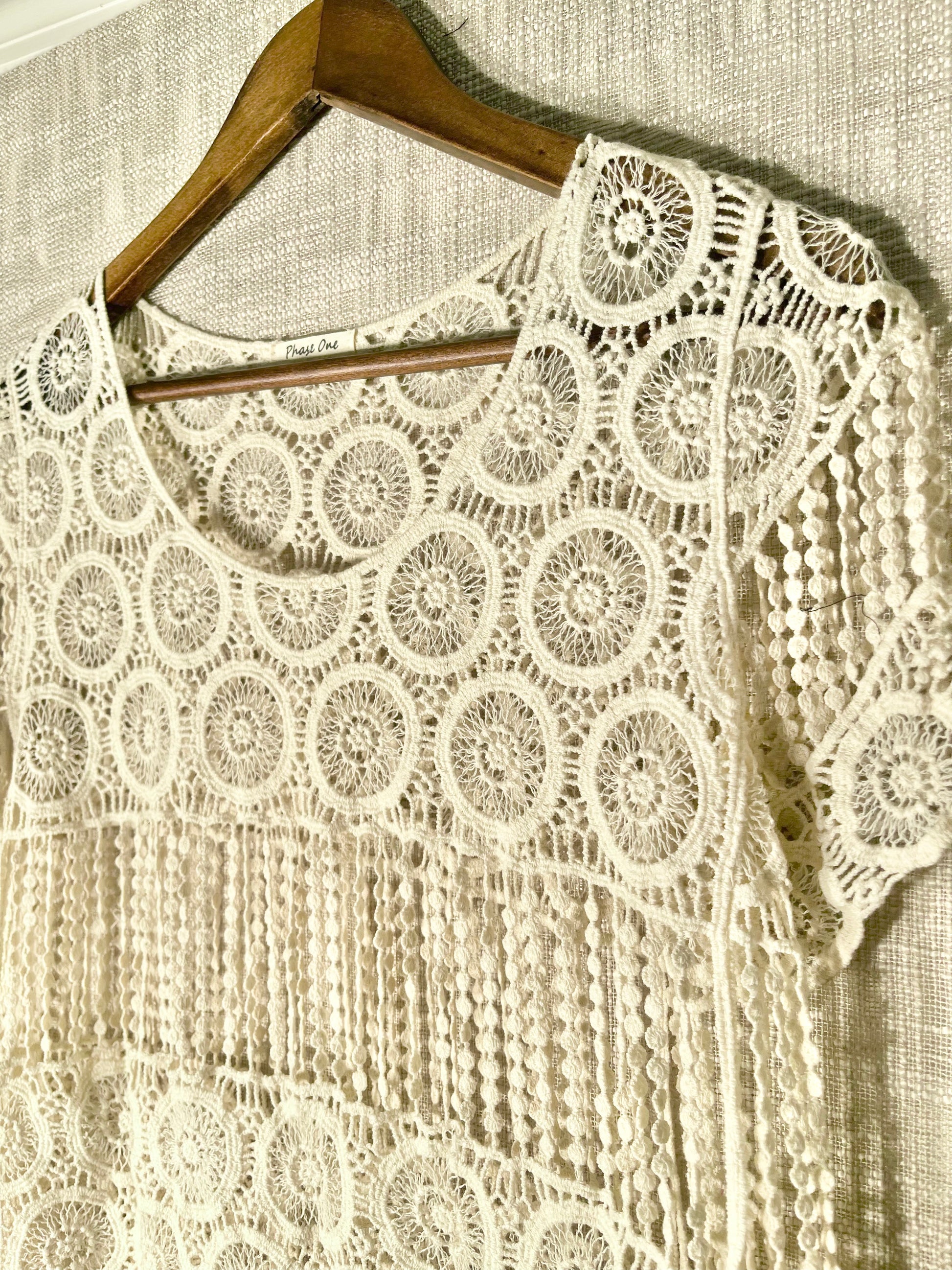 This great crocheted cover up is in great condition. Bohemian styled lace crocheted top can be worn with a camisole underneath or as a bathing suit coverup. Perfect for travel as it would be perfect paired with cream slacks and a cream camisole for a night on the town, or can be thrown into your beach bag for a trip down the coast. It is all about the style you make it.