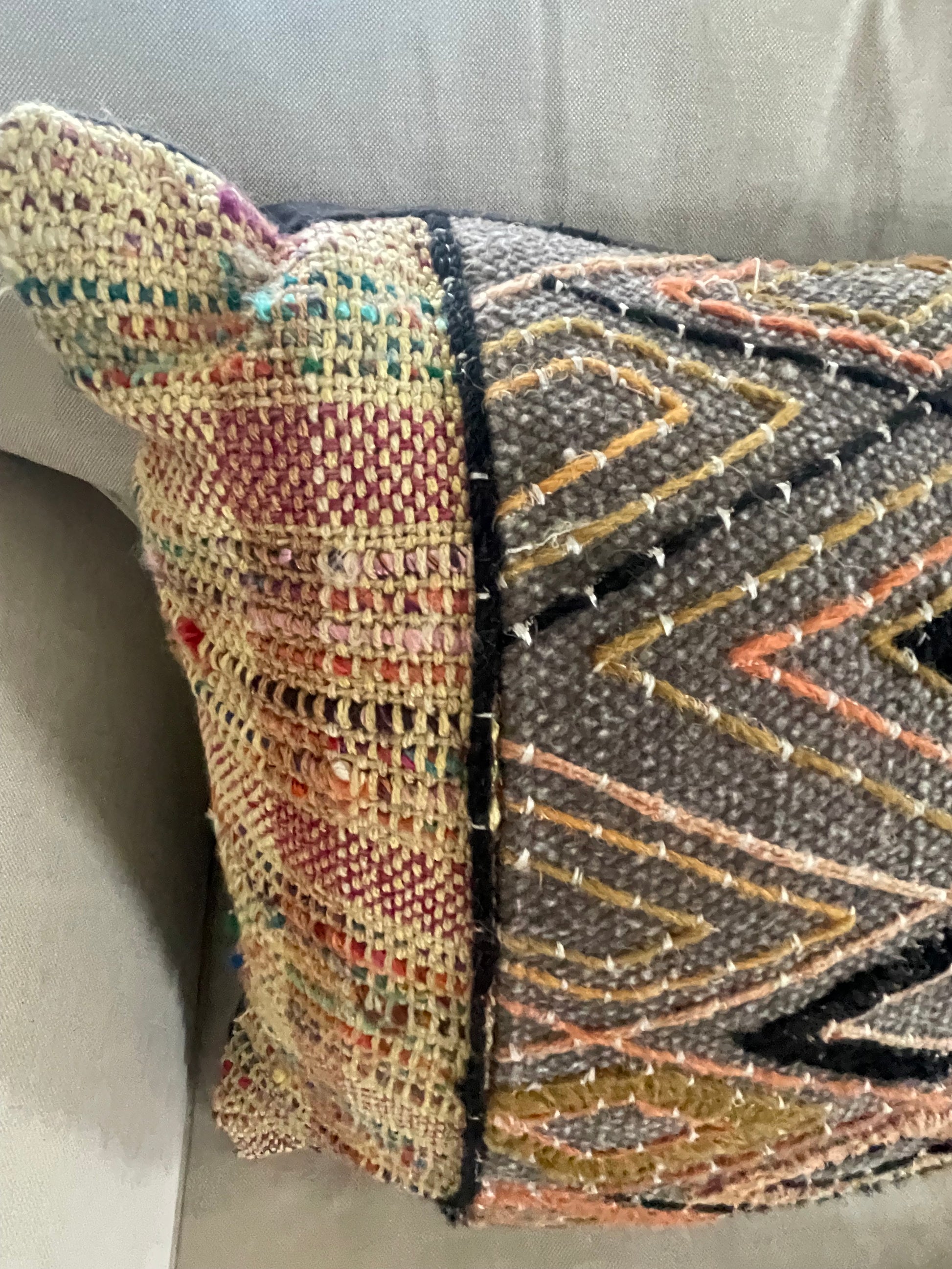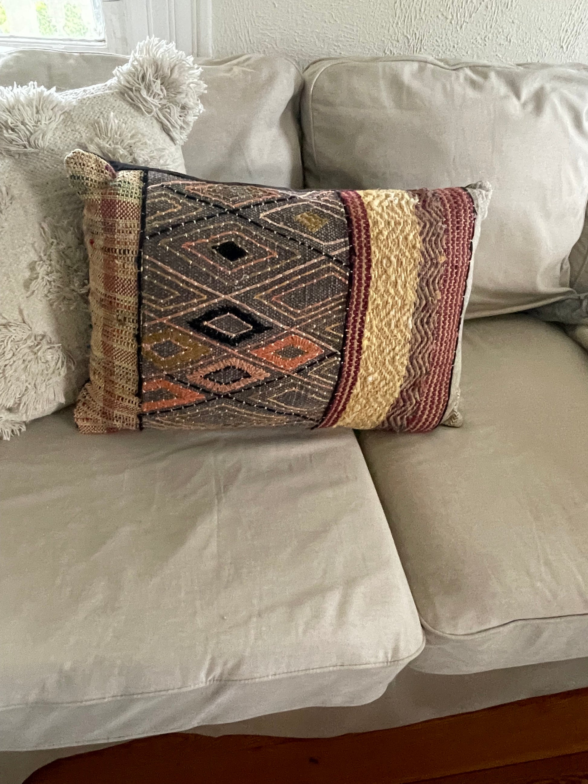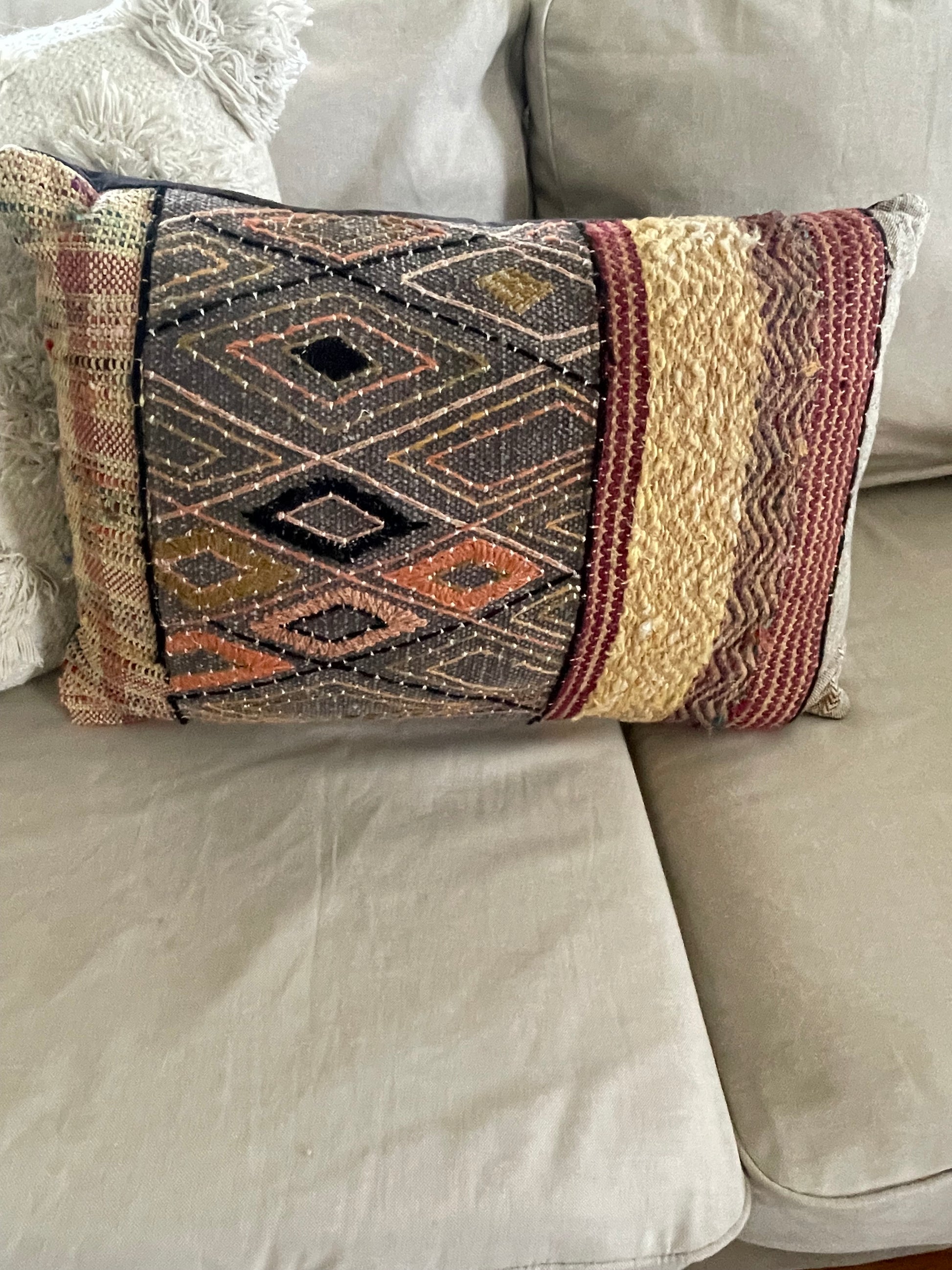 Hand woven vintage fabric pillow in all the right shades for fall. This pillow adds warmth and a great color pop while style being subtle and stylish. Our pillow will feel right at home in a country farmhouse, a modern loft, a boho eclectic living room, a traditional home, a sea side villa, a rustic cabin… you get the idea, this wonderful layering piece is a great addition to any home.