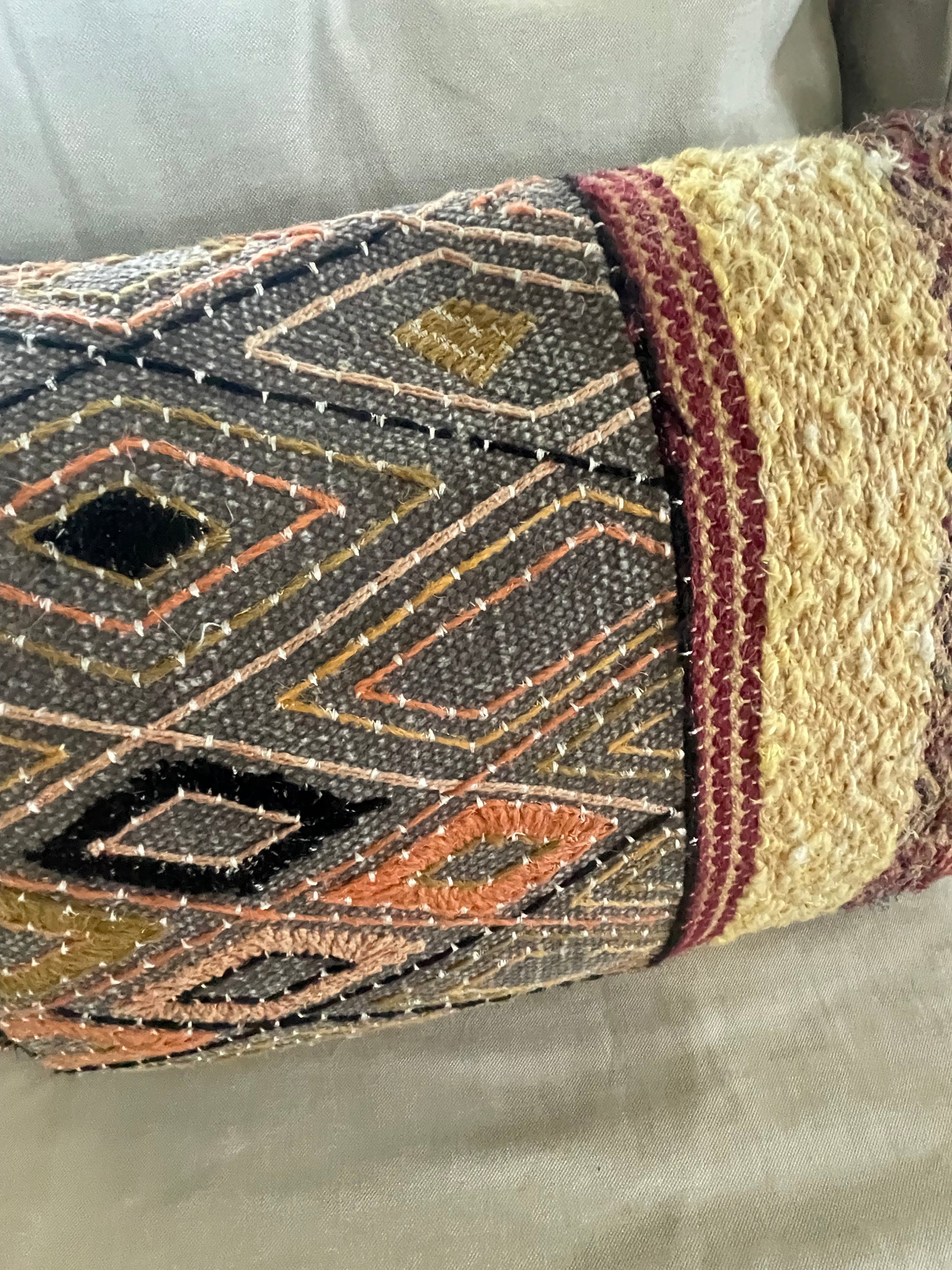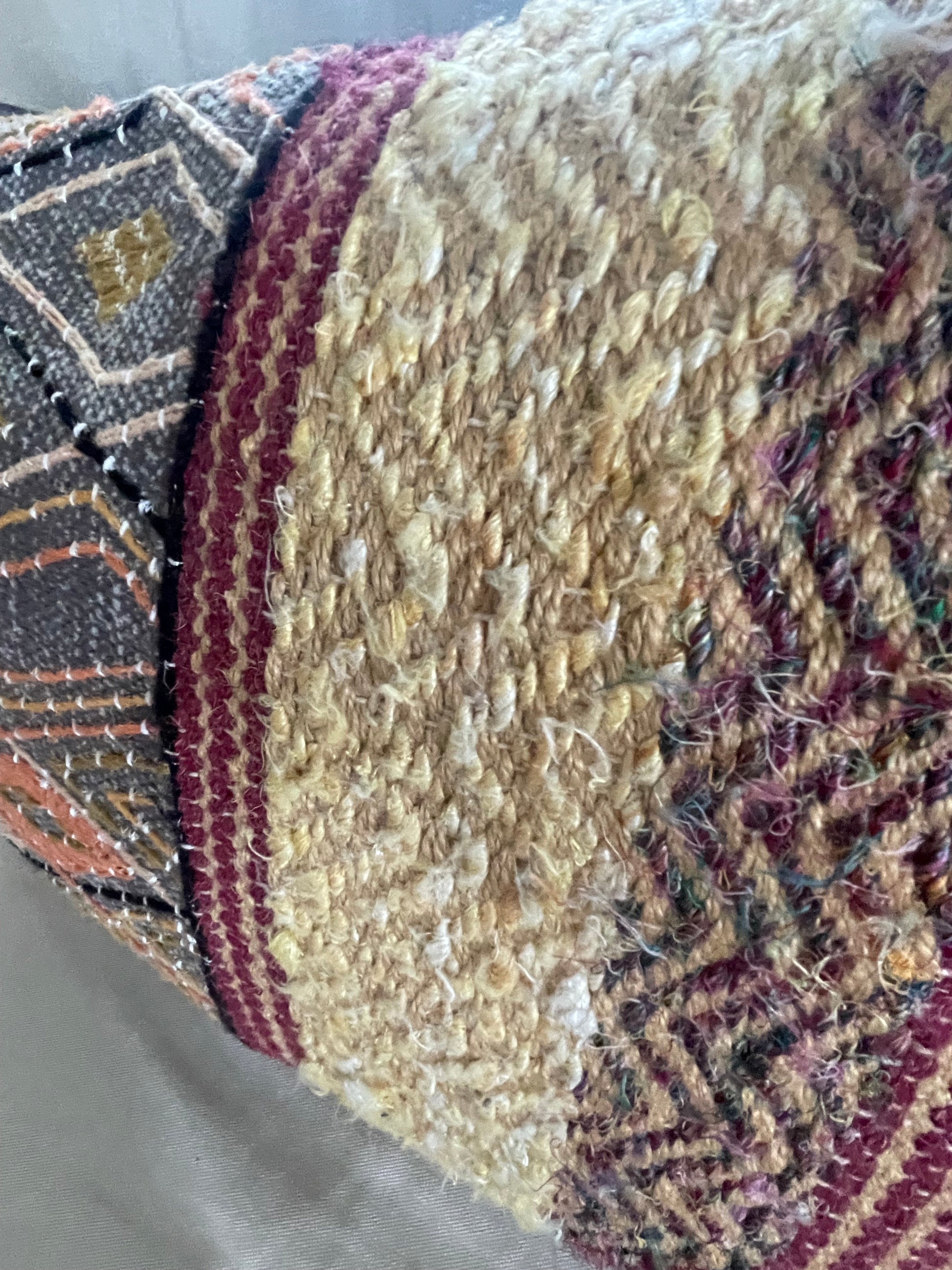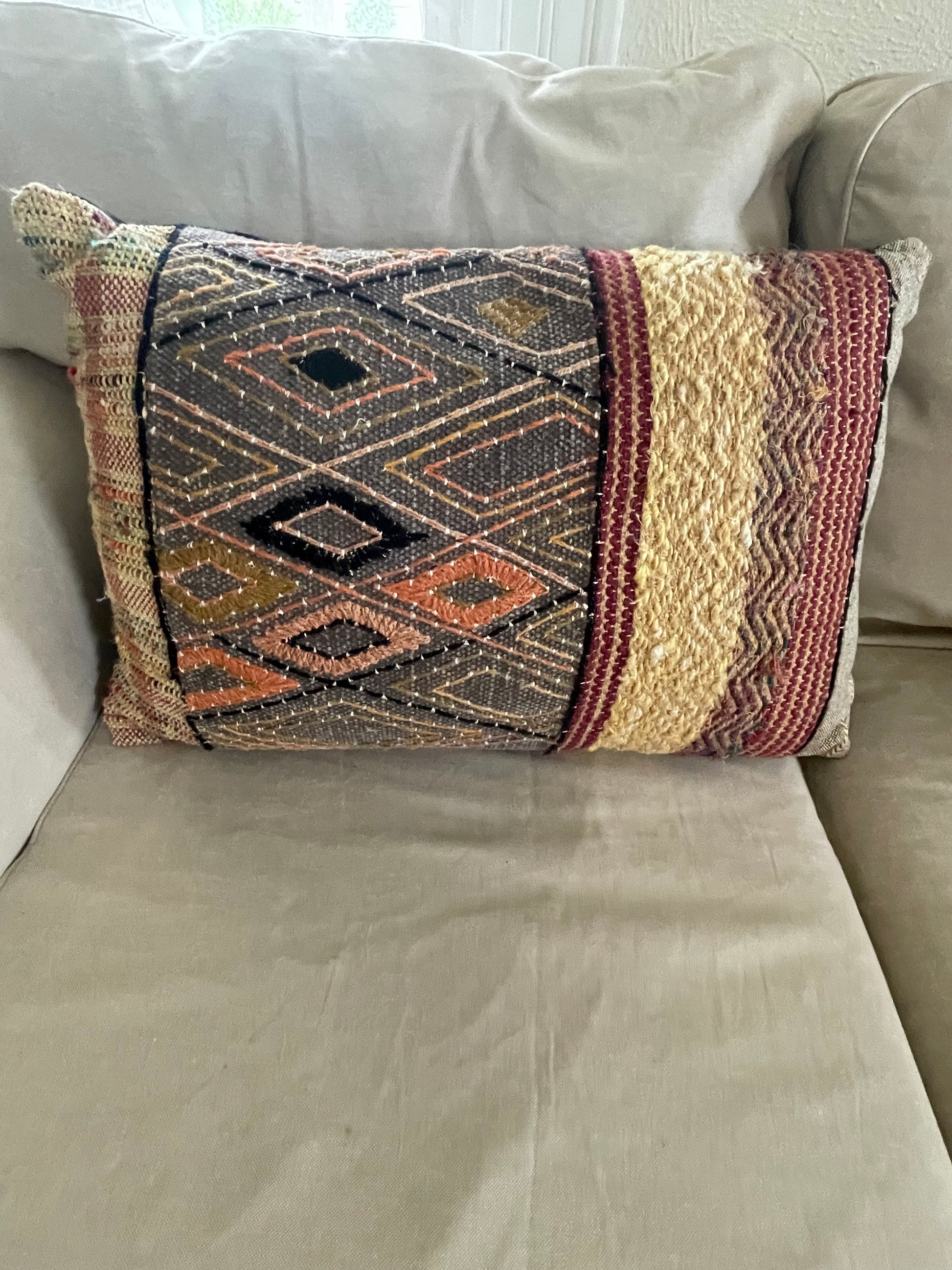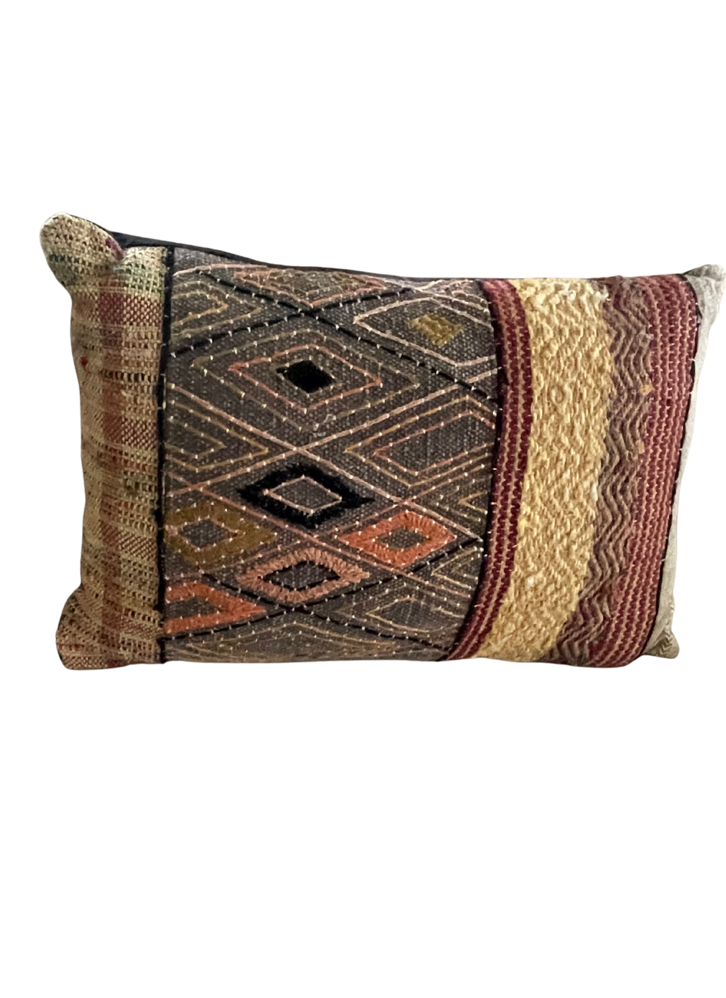 Hand woven vintage fabric pillow in all the right shades for fall. This pillow adds warmth and a great color pop while style being subtle and stylish. Our pillow will feel right at home in a country farmhouse, a modern loft, a boho eclectic living room, a traditional home, a sea side villa, a rustic cabin… you get the idea, this wonderful layering piece is a great addition to any home.